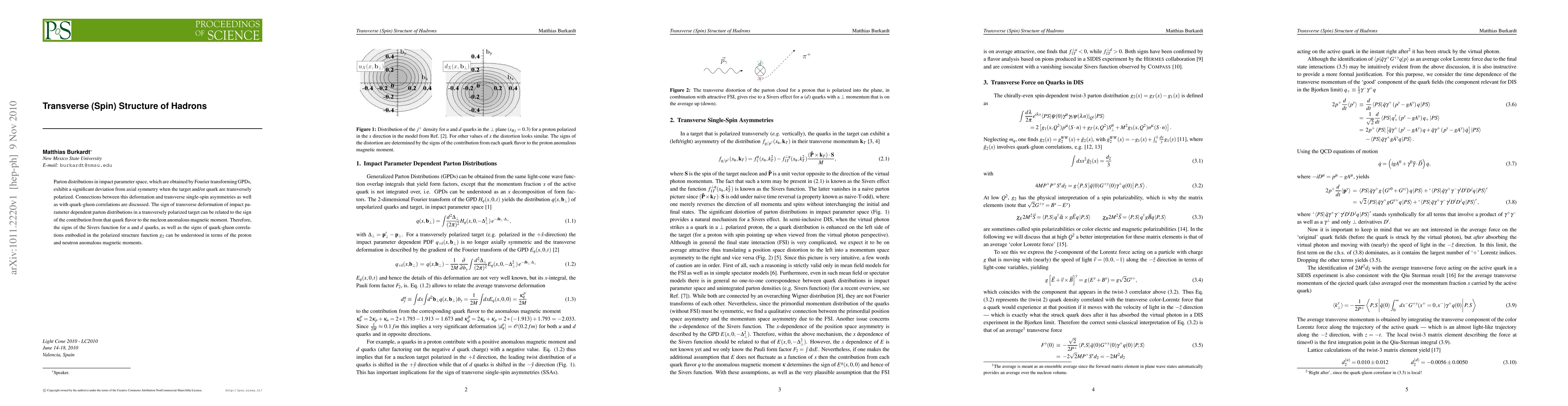 The research explores how parton distributions in hadrons, derived from Fourier-transformed Generalized Parton Distributions (GPDs), deviate from axial symmetry when target or quarks are transversely polarized. This deviation links to transverse single-spin asymmetries and quark-gluon correlations. The sign of this deformation can explain the signs of Sivers function for u and d quarks, and quark-gluon correlations in polarized structure function g2, in relation to proton and neutron anomalous magnetic moments.