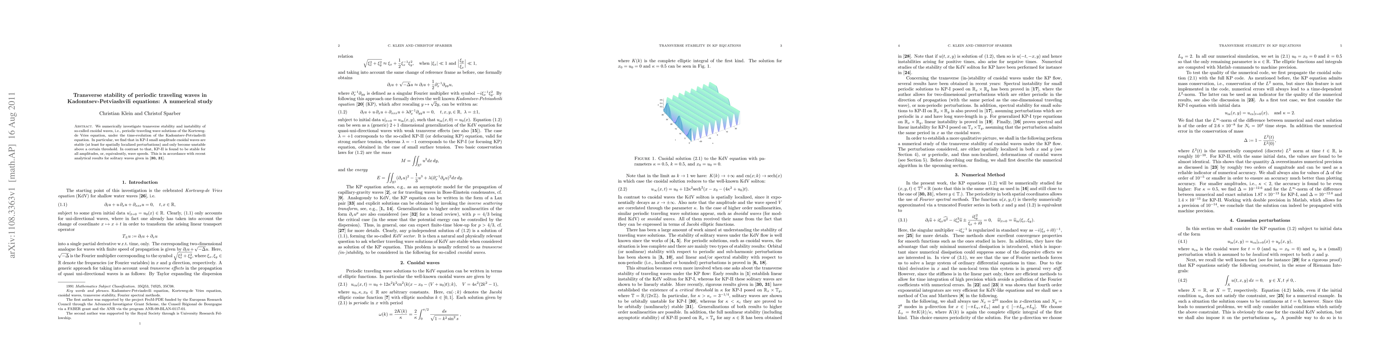 We numerically investigate transverse stability and instability of so-called cnoidal waves, i.e., periodic traveling wave solutions of the Korteweg-de Vries equation, under the time-evolution of the Kadomtsev-Petviashvili equation. In particular, we find that in KP-I small amplitude cnoidal waves are stable (at least for spatially localized perturbations) and only become unstable above a certain threshold. In contrast to that, KP-II is found to be stable for all amplitudes, or, equivalently, wave speeds. This is in accordance with recent analytical results for solitary waves given in \cite{RT1, RT2}.