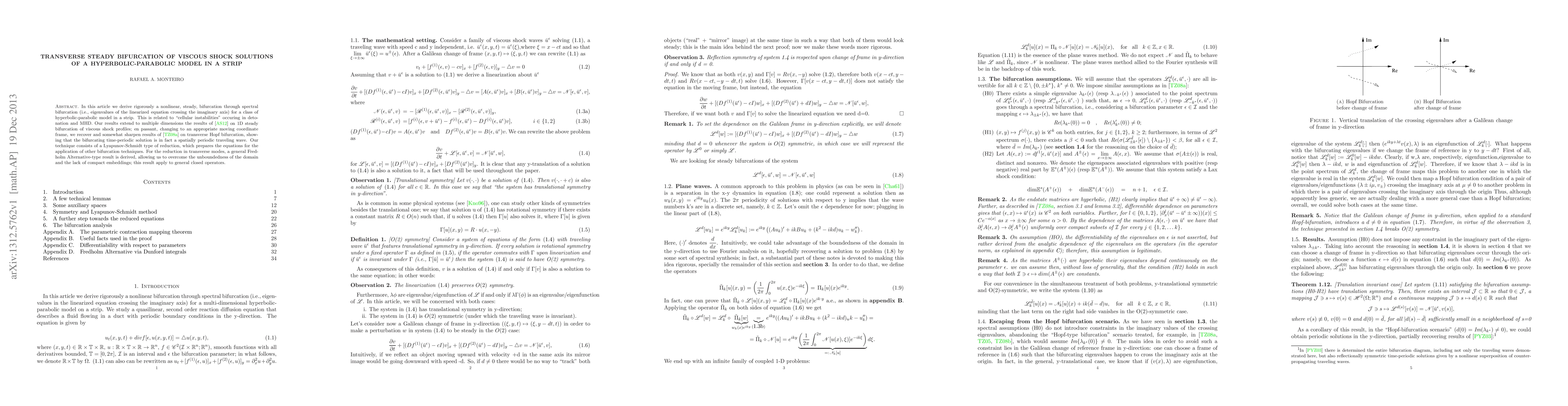 In this article we derive rigorously a nonlinear, steady, bifurcation through spectral bifurcation (i.e., eigenvalues of the linearized equation crossing the imaginary axis) for a class of hyperbolic-parabolic model in a strip. This is related to "cellular instabilities" occuring in detonation and MHD. Our results extend to multiple dimensions the results of Franz Achleitner and Peter Szmolyan (Saddle-node bifurcation of viscous profiles) on 1D steady bifurcation of viscous shock profiles; en passant, changing to an appropriate moving coordinate frame, we recover and somewhat sharpen results of Benjamin Texier and Kevin Zumbrun (Galloping instability of viscous shock waves) on transverse Hopf bifurcation, showing that the bifurcating time-periodic solution is in fact a spatially periodic traveling wave. Our technique consists of a Lyapunov-Schmidt type of reduction, which prepares the equations for the application of other bifurcation techniques. For the reduction in transverse modes, a general Fredholm Alternative-type result is derived, allowing us to overcome the unboundedness of the domain and the lack of compact embeddings; this result apply to general closed operators.
