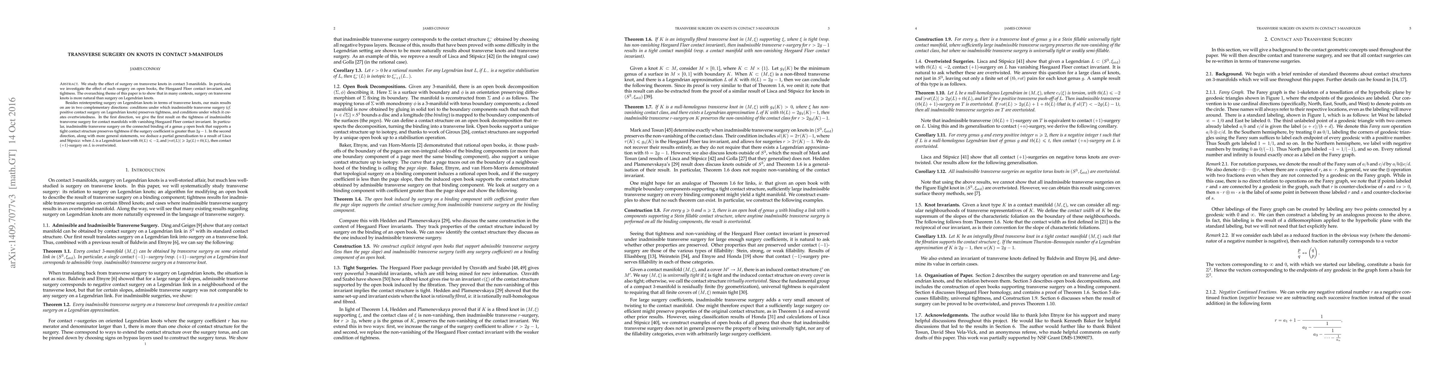 This paper explores the impact of surgery on transverse knots within contact 3-manifolds, particularly focusing on open books, Heegaard Floer contact invariants, and tightness. The authors argue that transverse surgery is often more natural than Legendrian surgery, providing conditions under which inadmissible transverse surgery preserves tightness or leads to overtwistedness.