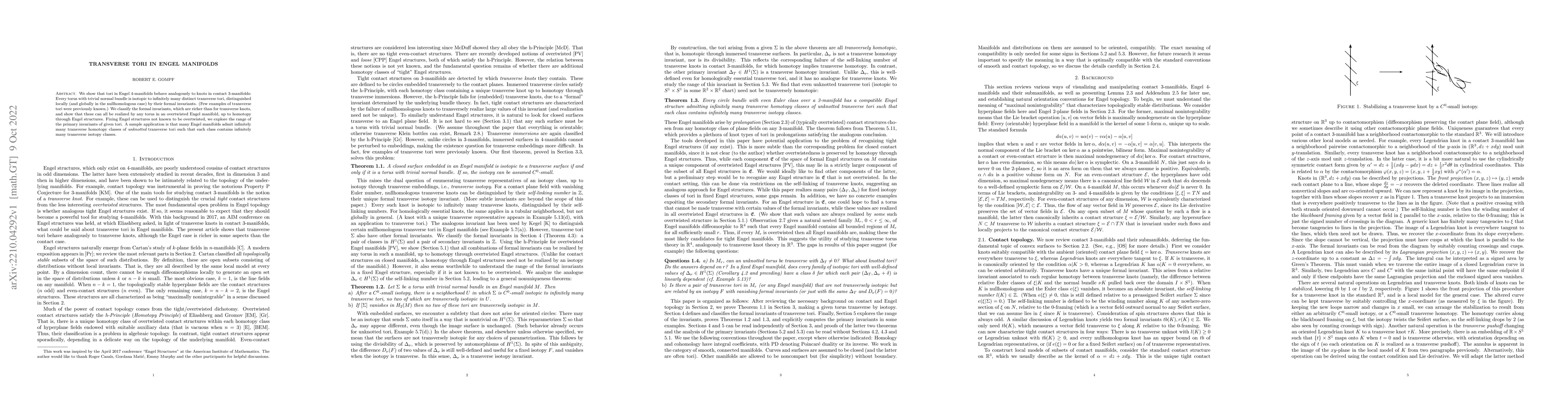 This paper demonstrates that tori in Engel 4-manifolds can be isotoped into infinitely many distinct transverse tori, akin to knots in contact 3-manifolds, and classifies their richer formal invariants which can be realized in overtwisted Engel manifolds. It explores the primary invariants of tori in non-overtwisted Engel structures and shows that many Engel manifolds harbor infinitely many transverse homotopy classes of unknotted transverse tori.