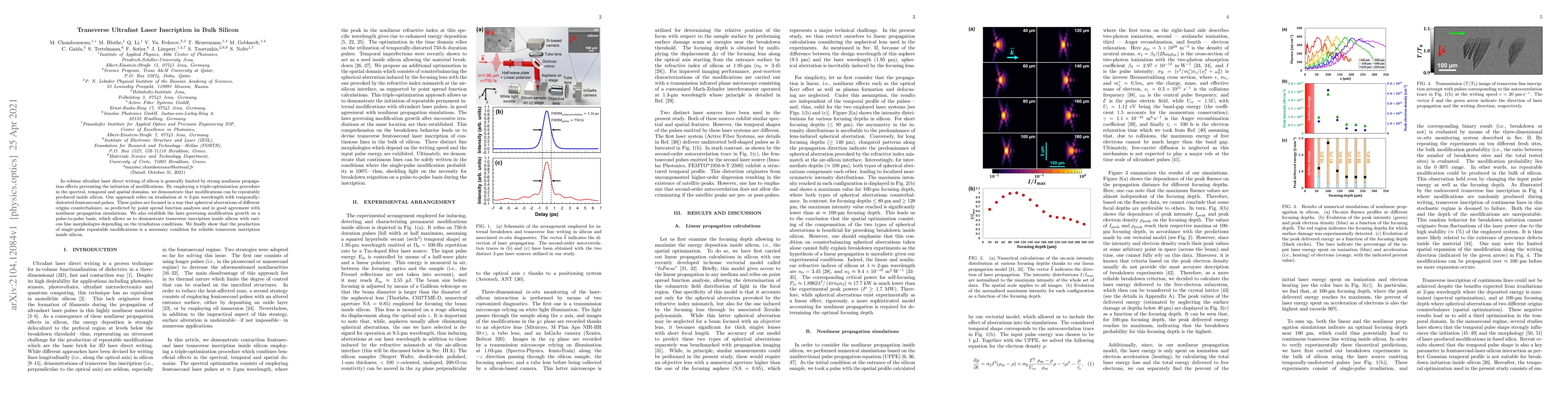 This paper demonstrates a triple-optimization method for in-volume ultrafast laser inscription in bulk silicon, overcoming nonlinear propagation effects through spectral, temporal, and spatial domain adjustments. The technique uses femtosecond pulses at approximately 2 µm wavelength, achieving transverse inscription with various line morphologies.