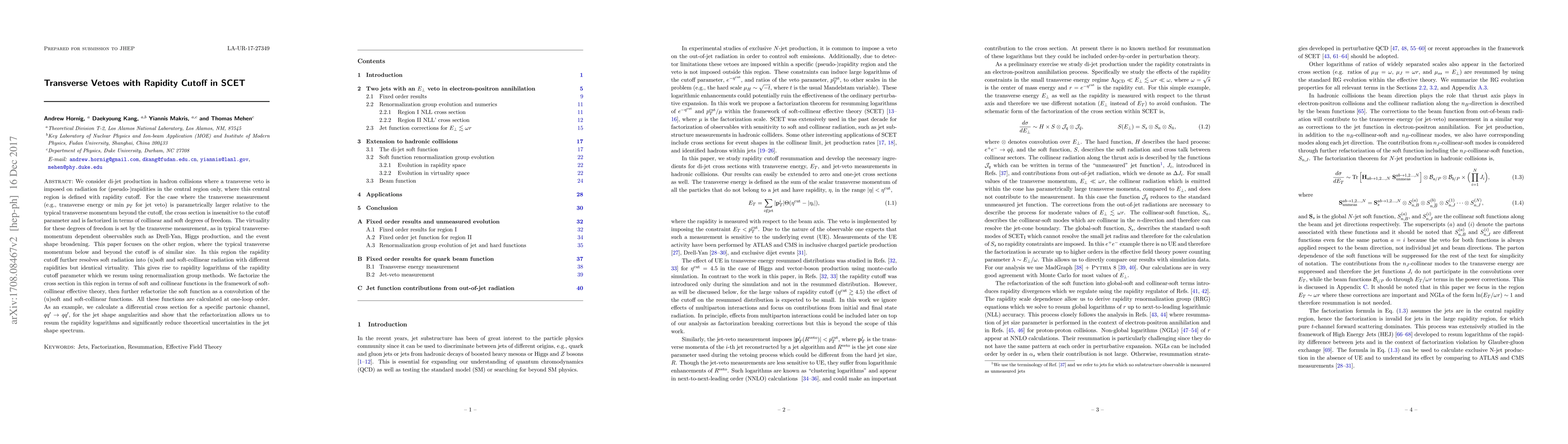 We consider di-jet production in hadron collisions where a transverse veto is imposed on radiation for (pseudo-)rapidities in the central region only, where this central region is defined with rapidity cutoff. For the case where the transverse measurement (e.g., transverse energy or min $p_T$ for jet veto) is parametrically larger relative to the typical transverse momentum beyond the cutoff, the cross section is insensitive to the cutoff parameter and is factorized in terms of collinear and soft degrees of freedom. The virtuality for these degrees of freedom is set by the transverse measurement, as in typical transverse-momentum dependent observables such as Drell-Yan, Higgs production, and the event shape broadening. This paper focuses on the other region, where the typical transverse momentum below and beyond the cutoff is of similar size. In this region the rapidity cutoff further resolves soft radiation into (u)soft and soft-collinear radiation with different rapidities but identical virtuality. This gives rise to rapidity logarithms of the rapidity cutoff parameter which we resum using renormalization group methods. We factorize the cross section in this region in terms of soft and collinear functions in the framework of soft-collinear effective theory, then further refactorize the soft function as a convolution of the (u)soft and soft-collinear functions. All these functions are calculated at one-loop order. As an example, we calculate a differential cross section for a specific partonic channel, $q q' \to q q'$, for the jet shape angularities and show that the refactorization allows us to resum the rapidity logarithms and significantly reduce theoretical uncertainties in the jet shape spectrum.