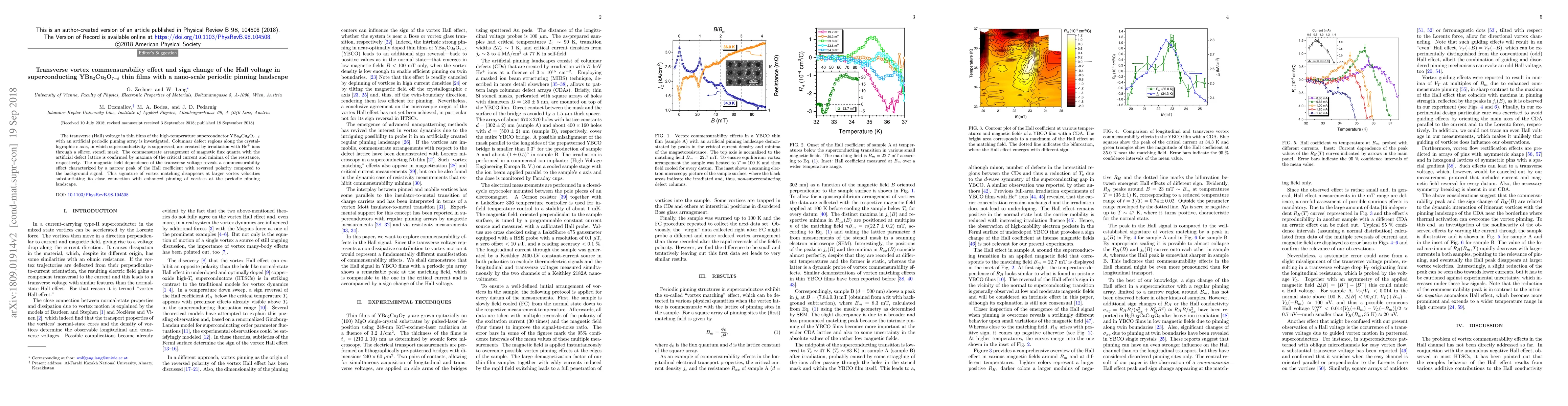 Researchers created a periodic pinning landscape in YBa$_{2}$Cu$_{3}$O$_{7- heta}$ thin films to study the Hall voltage, finding a commensurability effect with a sign change that disappears at higher vortex velocities.