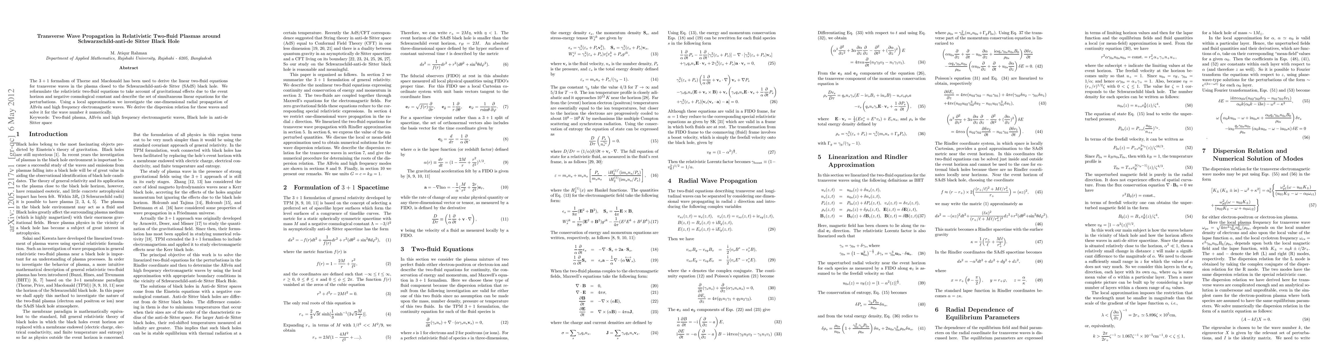 This paper derives linear two-fluid equations for transverse wave propagation in relativistic plasmas near a Schwarzschild-anti-de Sitter black hole, reformulating them to consider gravitational effects. It investigates Alfven and high-frequency electromagnetic wave propagation, deriving and numerically solving their dispersion relation.