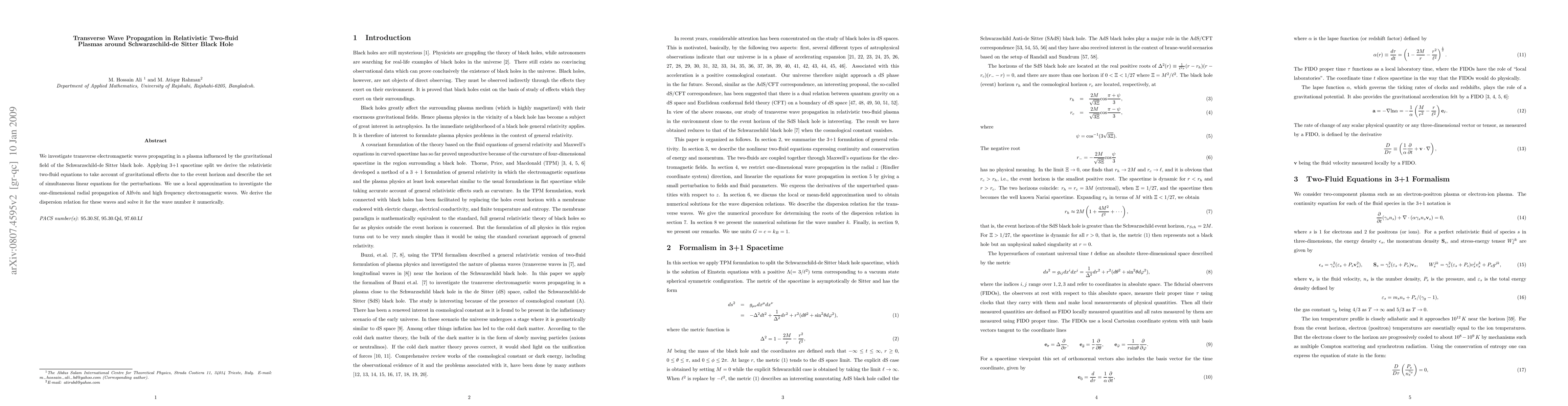 This paper examines transverse electromagnetic wave propagation in relativistic two-fluid plasmas near a Schwarzschild-de Sitter black hole, deriving the relativistic equations and solving the dispersion relation numerically to analyze Alfvén and high-frequency wave behavior.