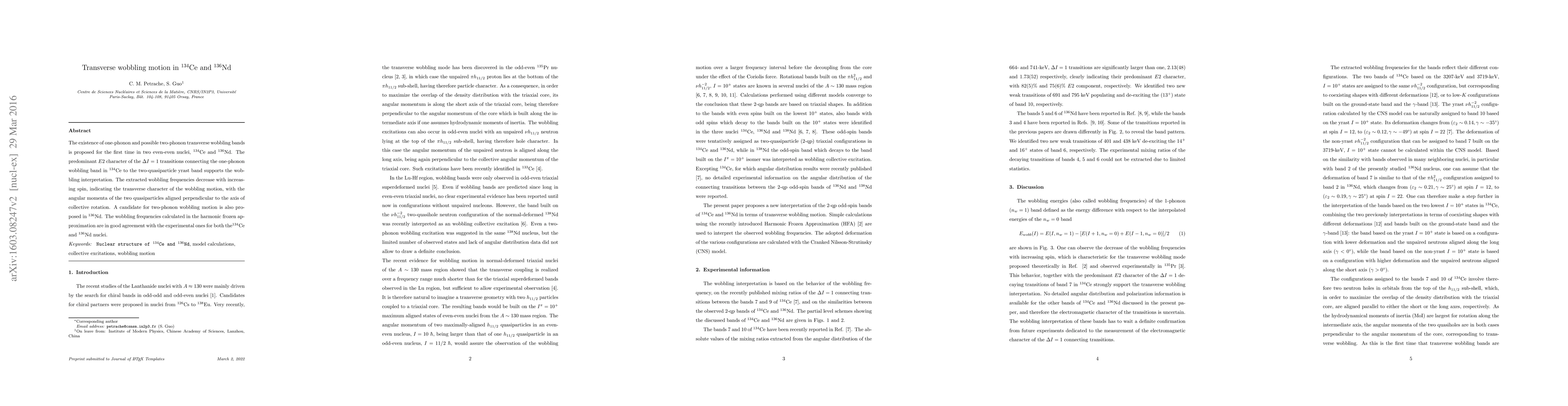 Researchers propose transverse wobbling motion in two even-even nuclei, $^{134}$Ce and $^{136}$Nd, with decreasing wobbling frequencies at higher spins, indicating a perpendicular alignment of quasiparticles.