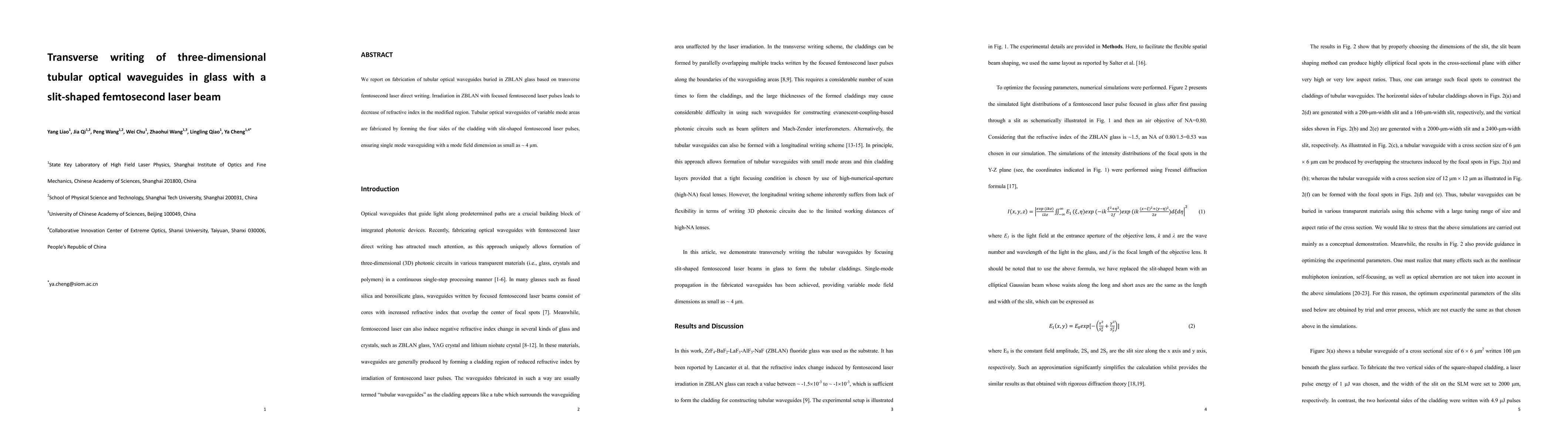 This paper details the fabrication of tubular optical waveguides in ZBLAN glass using transverse femtosecond laser direct writing, achieving single mode waveguiding with a mode field dimension of ~4 μm by creating slit-shaped cladding sides.