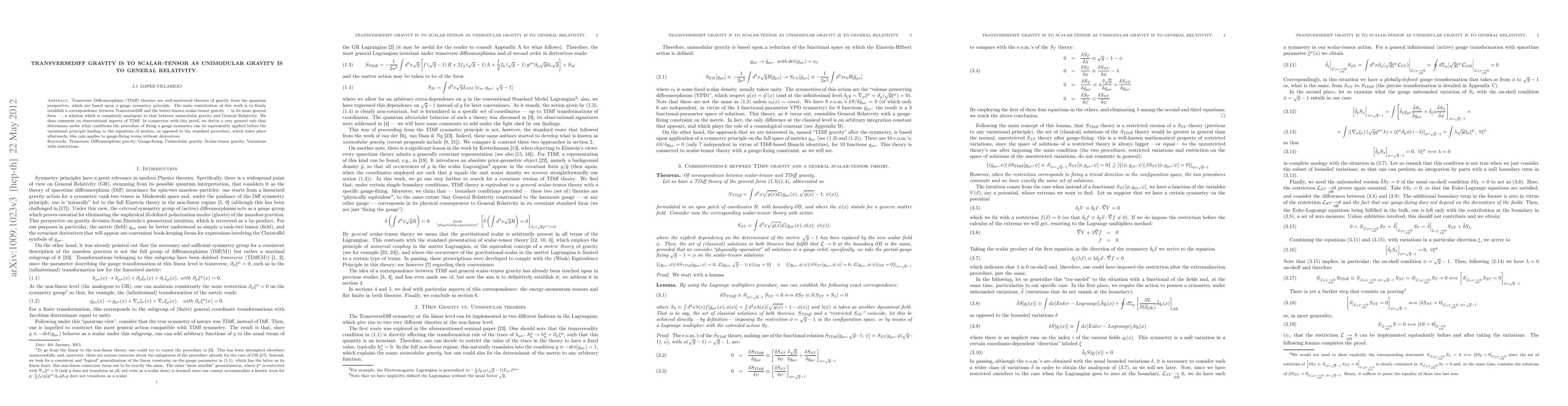 Transverse Diffeomorphism (TDiff) theories are well-motivated theories of gravity from the quantum perspective, which are based upon a gauge symmetry principle. The main contribution of this work is to firmly establish a correspondence between TransverseDiff and the better-known scalar-tensor gravity --- in its more general form ---, a relation which is completely analogous to that between unimodular gravity and General Relativity. We then comment on observational aspects of TDiff. In connection with this proof, we derive a very general rule that determines under what conditions the procedure of fixing a gauge symmetry can be equivalently applied before the variational principle leading to the equations of motion, as opposed to the standard procedure, which takes place afterwards; this rule applies to gauge-fixing terms without derivatives.
