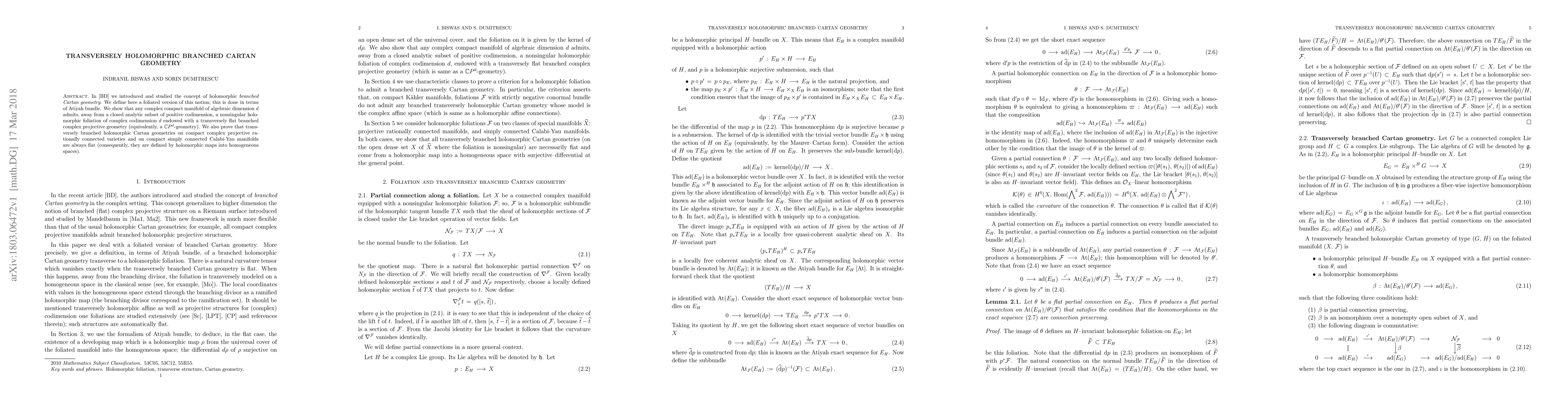 This paper extends the concept of holomorphic branched Cartan geometry to include foliations on complex manifolds, demonstrating that complex compact manifolds can support nonsingular foliations with transversely flat branched complex projective geometries. It further proves that such geometries on compact complex projective rationally connected varieties and on simply connected Calabi-Yau manifolds are flat.