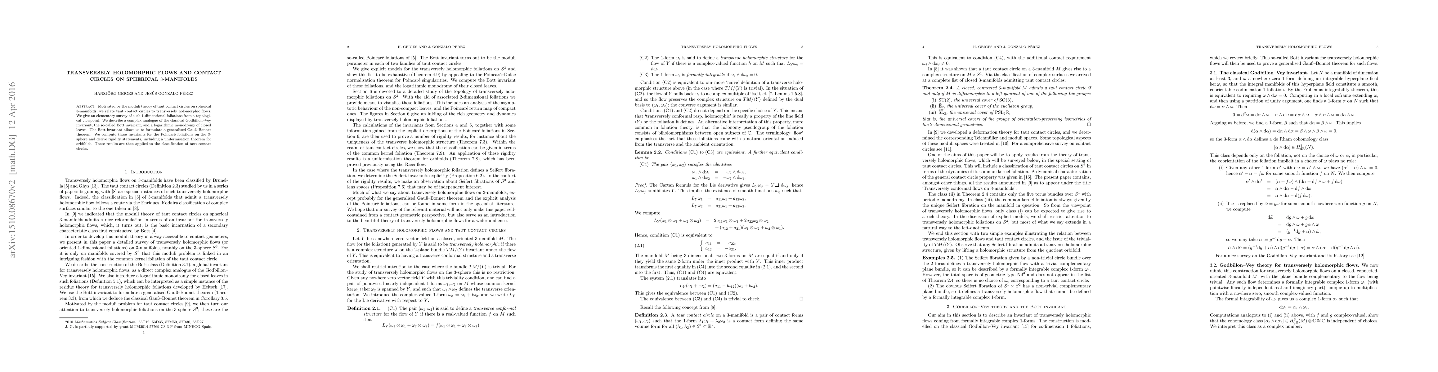 Motivated by the moduli theory of taut contact circles on spherical 3-manifolds, we relate taut contact circles to transversely holomorphic flows. We give an elementary survey of such 1-dimensional foliations from a topological viewpoint. We describe a complex analogue of the classical Godbillon-Vey invariant, the so-called Bott invariant, and a logarithmic monodromy of closed leaves. The Bott invariant allows us to formulate a generalised Gau{\ss}-Bonnet theorem. We compute these invariants for the Poincar\'e foliations on the 3-sphere and derive rigidity statements, including a uniformisation theorem for orbifolds. These results are then applied to the classification of taut contact circles.