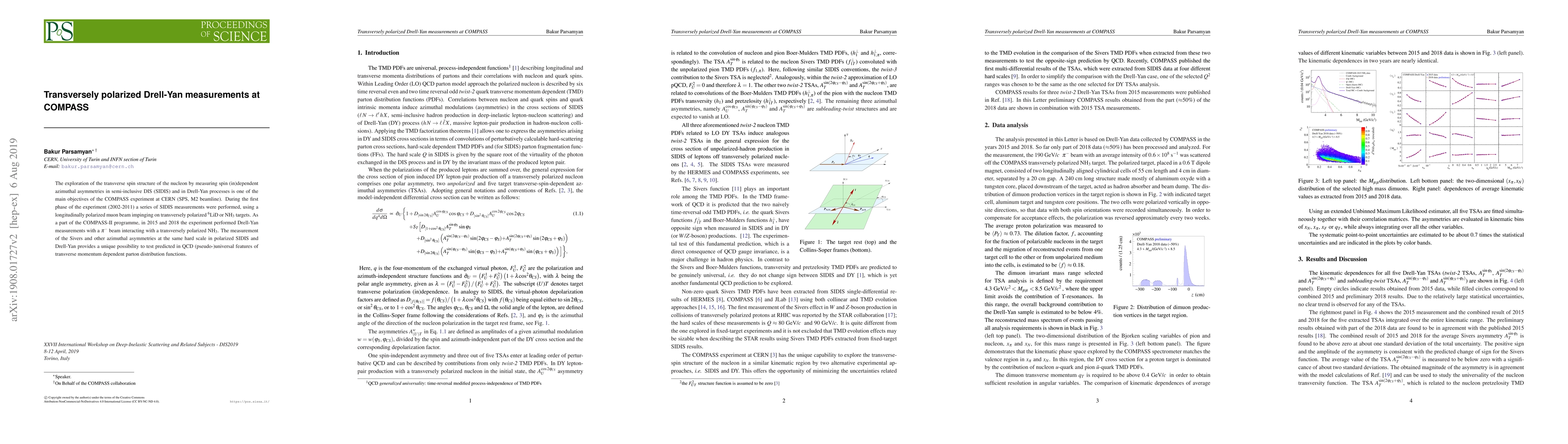 The COMPASS experiment at CERN investigates the transverse spin structure of nucleons through Drell-Yan measurements with a $\pi^-$ beam and transversely polarized NH$_3$ targets, complementing earlier SIDIS measurements. These studies aim to test QCD predictions regarding transverse momentum dependent parton distribution functions.