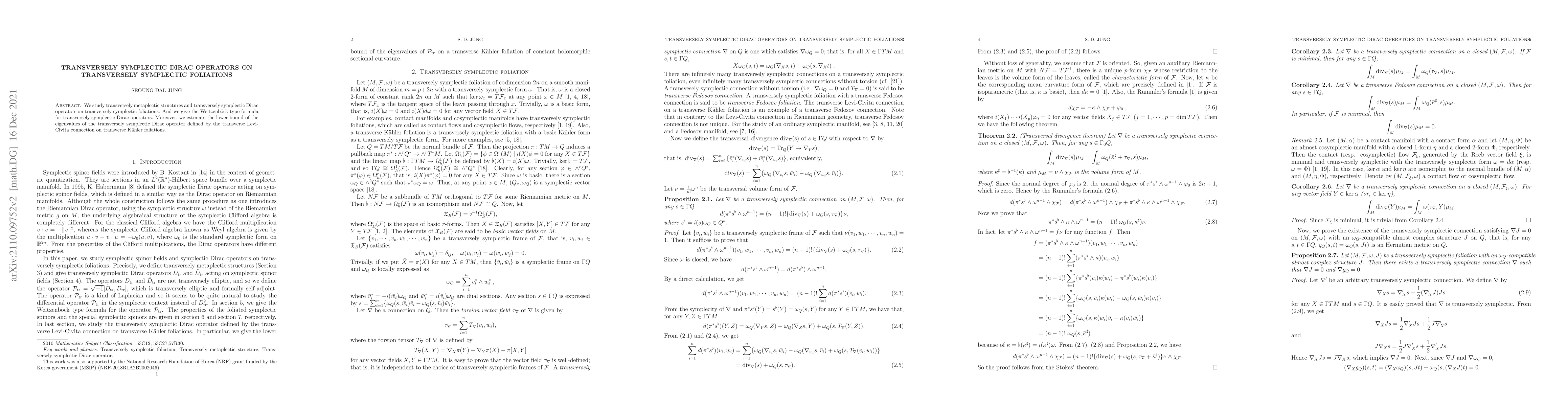 We study the transversely metaplectic structure and the transversely symplectic Dirac operator on a transversely symplectic foliation. Moreover, we give the Weitzenbock type formula for transversely symplectic Dirac operators and we estimate the lower bound of the eigenvalues of the transversely symplectic Dirac operator on special spinors space on transverse Kahler foliations.