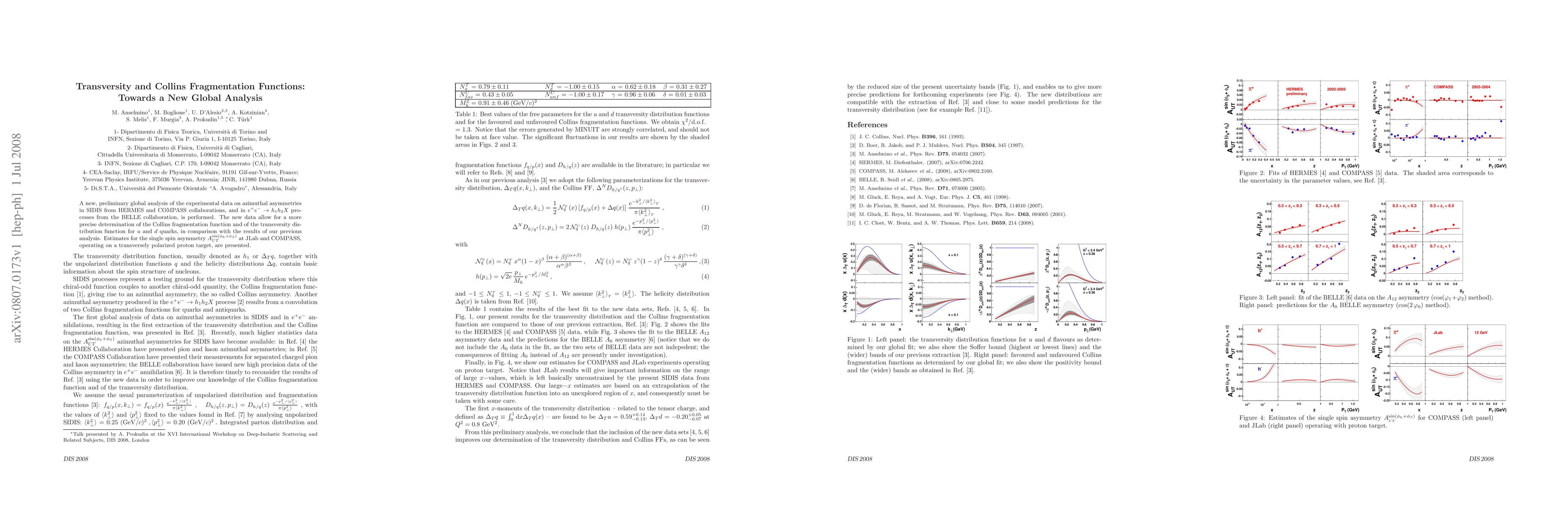 A new, preliminary global analysis of the experimental data on azimuthal asymmetries in SIDIS from HERMES and COMPASS collaborations, and in e+e- --> h_1 h_2 X processes from the BELLE collaboration, is performed. The new data allow for a more precise determination of the Collins fragmentation function and of the transversity distribution function for $u$ and $d$ quarks, in comparison with the results of our previous analysis. Estimates for the single spin asymmetry A_UT^{\sin(\phi_h + \phi_S)} at JLab and COMPASS, operating on a transversely polarized proton target, are presented.