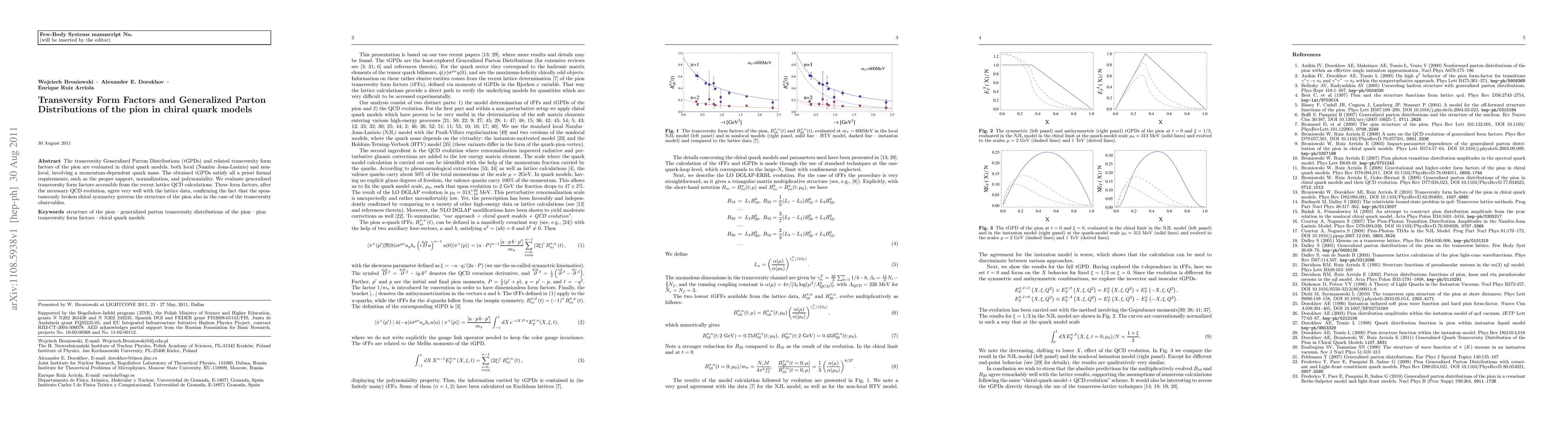 This paper evaluates the transversity Generalized Parton Distributions (tGPDs) and related form factors of the pion using chiral quark models, showing good agreement with lattice QCD calculations and confirming the role of spontaneously broken chiral symmetry in the pion's structure. The tGPDs meet all formal requirements, including support, normalization, and polynomiality.