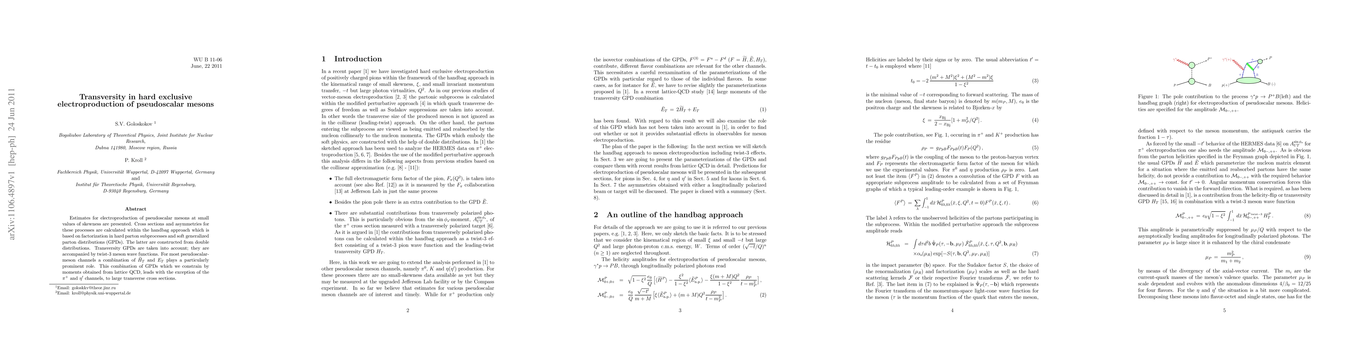This paper calculates cross sections and asymmetries for the hard exclusive electroproduction of pseudoscalar mesons, focusing on the role of transversity in the process. It employs the handbag approach, incorporating factorization in hard parton subprocesses and soft generalized parton distributions (GPDs), specifically transversity GPDs, which are constrained by lattice QCD moments, leading to significant transverse cross sections for most channels.