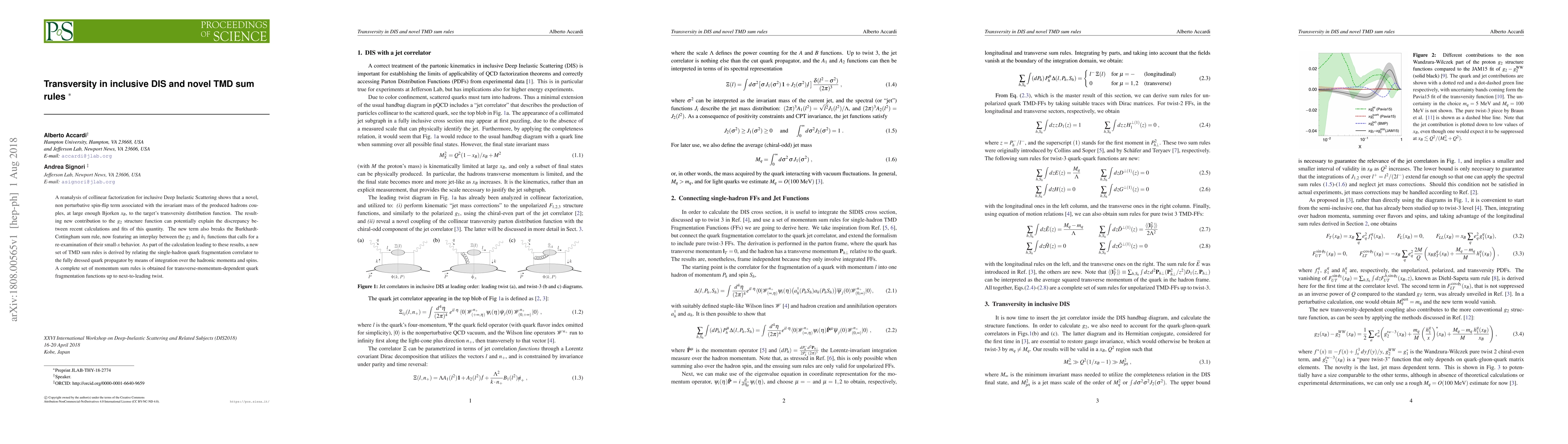 A reanalysis of collinear factorization for inclusive Deep Inelastic Scattering shows that a novel, non perturbative spin-flip term associated with the invariant mass of the produced hadrons couples, at large enough Bjorken $x_B$, to the target's transversity distribution function. The resulting new contribution to the $g_2$ structure function can potentially explain the discrepancy between recent calculations and fits of this quantity. The new term also breaks the Burkhardt-Cottingham sum rule, now featuring an interplay between the $g_2$ and $h_1$ functions that calls for a re-examination of their small-$x$ behavior. As part of the calculation leading to these results, a new set of TMD sum rules is derived by relating the single-hadron quark fragmentation correlator to the fully dressed quark propagator by means of integration over the hadronic momenta and spins. A complete set of momentum sum rules is obtained for transverse-momentum-dependent quark fragmentation functions up to next-to-leading twist.