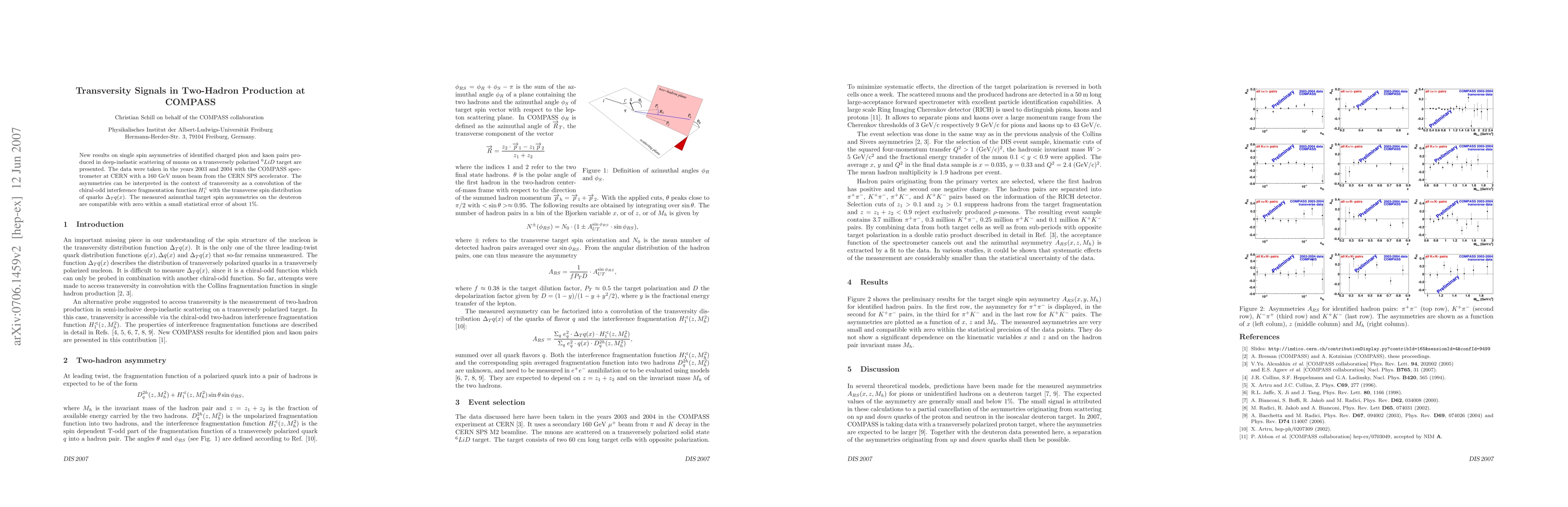 The COMPASS experiment at CERN analyzed data from 2003-2004, measuring single spin asymmetries in charged pion and kaon pairs produced via deep-inelastic muon scattering off a transversely polarized 6LiD target. Results indicate these asymmetries, interpretable as transversity, are nearly zero within a small statistical error, suggesting limited influence of chiral-odd fragmentation functions and quark transverse spin distributions.