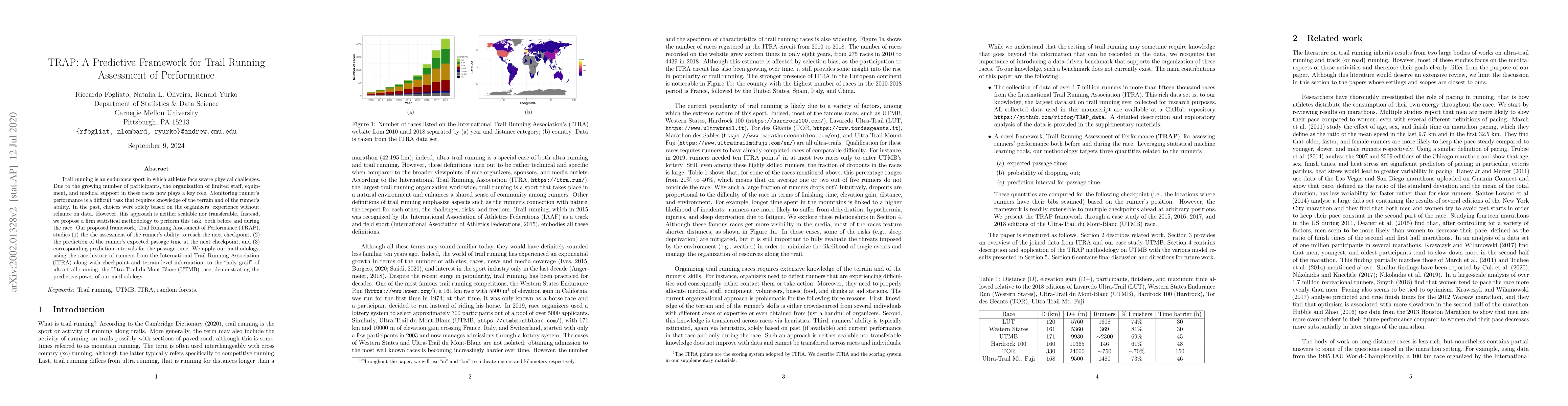 The paper introduces TRAP, a predictive framework for assessing trail running performance, which uses statistical methods to evaluate runners' abilities and predict passage times at checkpoints. It employs a Python package, ScrapITRA, to gather historical data from the International Trail Running Association (ITRA) and demonstrates its effectiveness using the Ultra-Trail du Mont-Blanc (UTMB) race data.