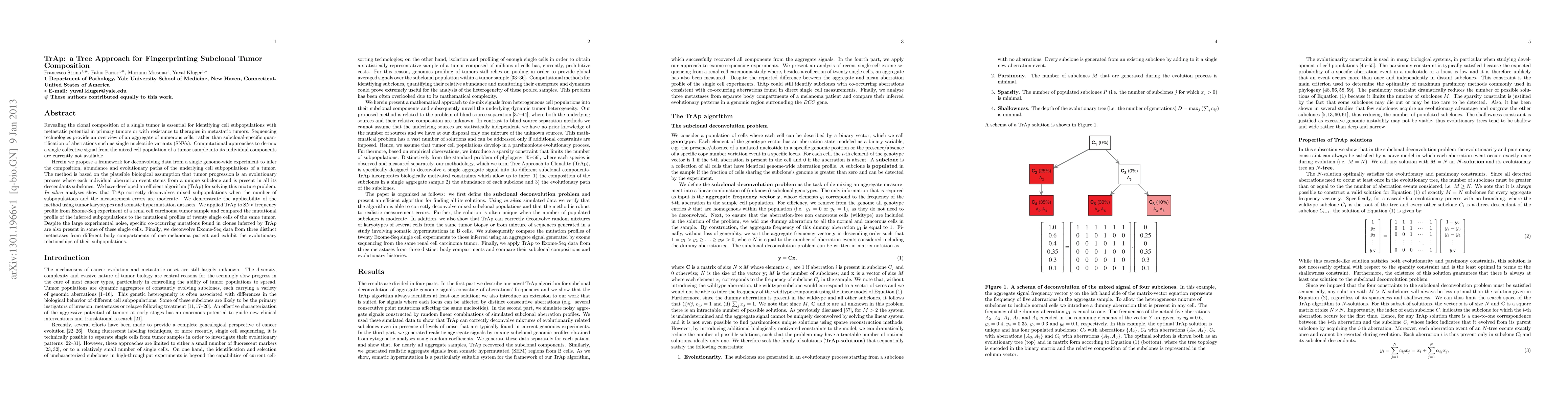 Revealing the clonal composition of a single tumor is essential for identifying cell subpopulations with metastatic potential in primary tumors or with resistance to therapies in metastatic tumors. Sequencing technologies provide an overview of an aggregate of numerous cells, rather than subclonal-specific quantification of aberrations such as single nucleotide variants (SNVs). Computational approaches to de-mix a single collective signal from the mixed cell population of a tumor sample into its individual components are currently not available. Herein we propose a framework for deconvolving data from a single genome-wide experiment to infer the composition, abundance and evolutionary paths of the underlying cell subpopulations of a tumor. The method is based on the plausible biological assumption that tumor progression is an evolutionary process where each individual aberration event stems from a unique subclone and is present in all its descendants subclones. We have developed an efficient algorithm (TrAp) for solving this mixture problem. In silico analyses show that TrAp correctly deconvolves mixed subpopulations when the number of subpopulations and the measurement errors are moderate. We demonstrate the applicability of the method using tumor karyotypes and somatic hypermutation datasets. We applied TrAp to SNV frequency profile from Exome-Seq experiment of a renal cell carcinoma tumor sample and compared the mutational profile of the inferred subpopulations to the mutational profiles of twenty single cells of the same tumor. Despite the large experimental noise, specific co-occurring mutations found in clones inferred by TrAp are also present in some of these single cells. Finally, we deconvolve Exome-Seq data from three distinct metastases from different body compartments of one melanoma patient and exhibit the evolutionary relationships of their subpopulations.