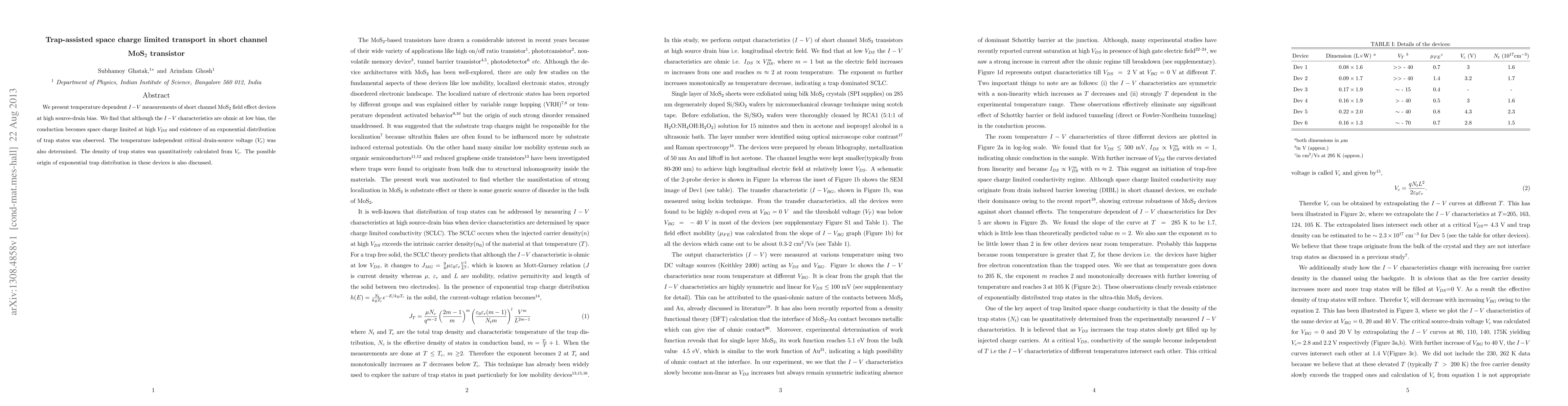 This paper investigates temperature-dependent $I-V$ characteristics in short channel MoS$_2$ transistors, revealing that conduction transitions from Ohmic to space charge limited at high bias, with an exponential trap state distribution. The critical voltage $V_c$ and trap state density are determined, and the origin of the exponential trap distribution is discussed.