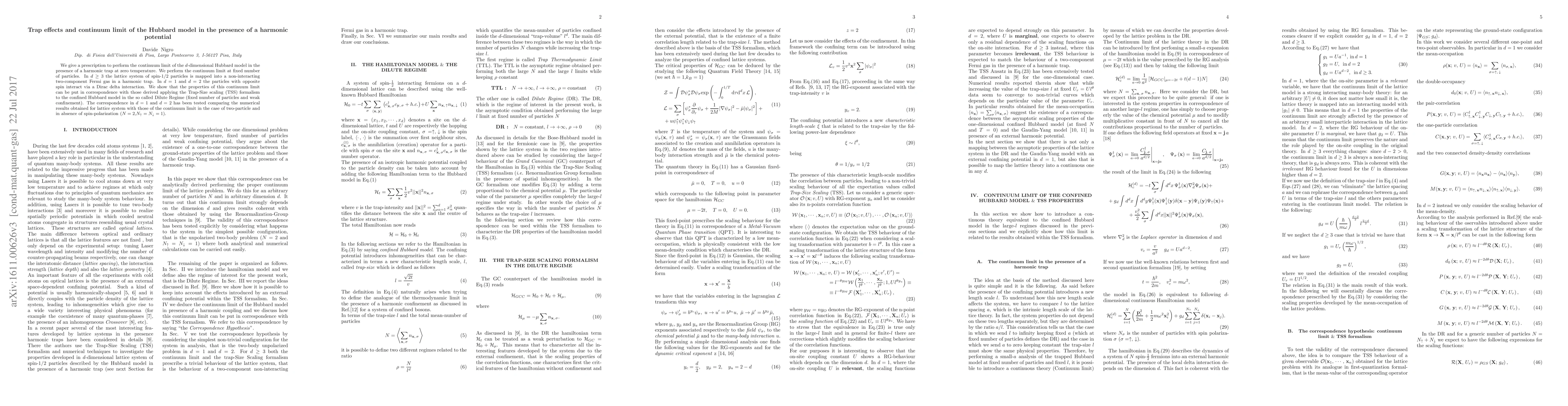 This paper outlines a method to take the continuum limit of the Hubbard model under a harmonic potential, showing that in higher dimensions it maps to a non-interacting Fermi gas, while in lower dimensions it results in a spin-dependent interaction. The results align with the Trap-Size scaling formalism in the dilute regime, validated by numerical comparisons for a two-particle system.