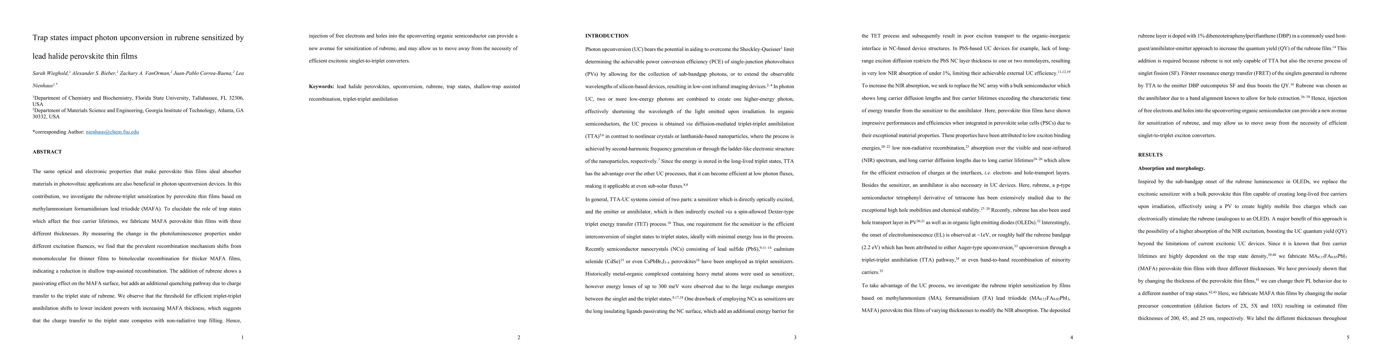 The same optical and electronic properties that make perovskite thin films ideal absorber materials in photovoltaic applications are also beneficial in photon upconversion devices. In this contribution, we investigate the rubrene-triplet sensitization by perovskite thin films based on methylammonium formamidinium lead triiodide (MAFA). To elucidate the role of trap states which affect the free carrier lifetimes, we fabricate MAFA perovskite thin films with three different thicknesses. By measuring the change in the photoluminescence properties under different excitation fluences, we find that the prevalent recombination mechanism shifts from monomolecular for thinner films to bimolecular recombination for thicker MAFA films, indicating a reduction in shallow trap-assisted recombination. The addition of rubrene shows a passivating effect on the MAFA surface, but adds an additional quenching pathway due to charge transfer to the triplet state of rubrene. We observe that the threshold for efficient triplet-triplet annihilation shifts to lower incident powers with increasing MAFA thickness, which suggests that the charge transfer to the triplet state competes with non-radiative trap filling. Hence, injection of free electrons and holes into the upconverting organic semiconductor can provide a new avenue for sensitization of rubrene, and may allow us to move away from the necessity of efficient excitonic singlet-to-triplet converters.