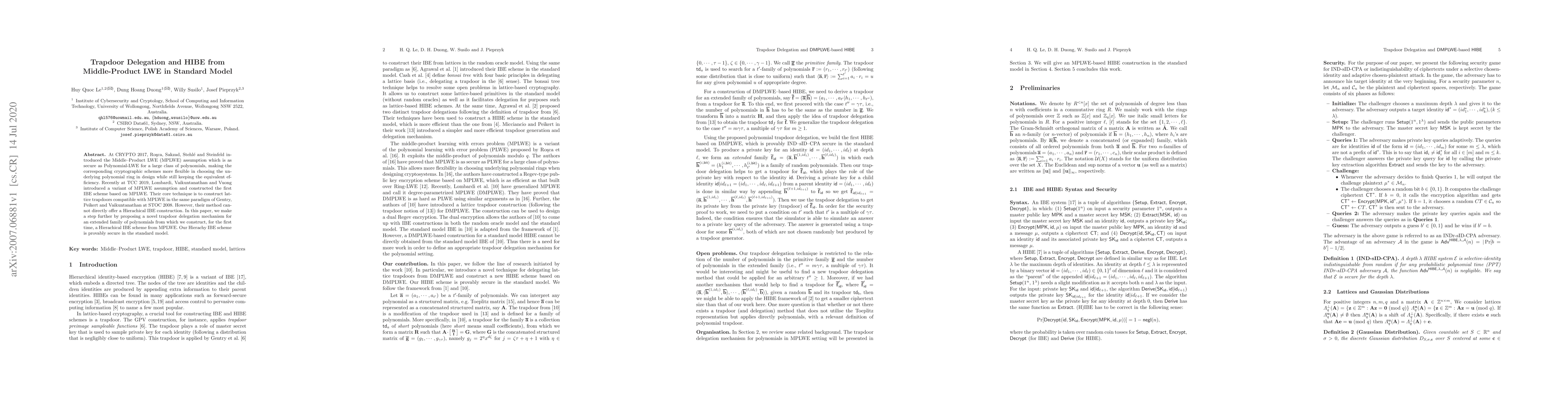 At CRYPTO 2017, Rosca, Sakzad, Stehle and Steinfeld introduced the Middle--Product LWE (MPLWE) assumption which is as secure as Polynomial-LWE for a large class of polynomials, making the corresponding cryptographic schemes more flexible in choosing the underlying polynomial ring in design while still keeping the equivalent efficiency. Recently at TCC 2019, Lombardi, Vaikuntanathan and Vuong introduced a variant of MPLWE assumption and constructed the first IBE scheme based on MPLWE. Their core technique is to construct lattice trapdoors compatible with MPLWE in the same paradigm of Gentry, Peikert and Vaikuntanathan at STOC 2008. However, their method cannot directly offer a Hierachical IBE construction. In this paper, we make a step further by proposing a novel trapdoor delegation mechanism for an extended family of polynomials from which we construct, for the first time, a Hierachical IBE scheme from MPLWE. Our Hierachy IBE scheme is provably secure in the standard model.