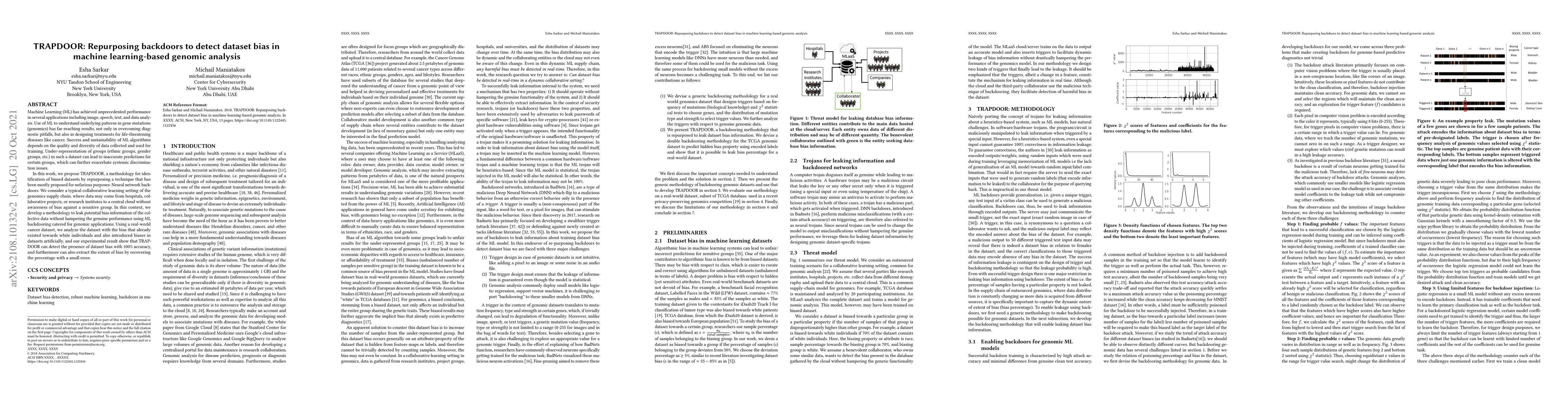 Machine Learning (ML) has achieved unprecedented performance in several applications including image, speech, text, and data analysis. Use of ML to understand underlying patterns in gene mutations (genomics) has far-reaching results, not only in overcoming diagnostic pitfalls, but also in designing treatments for life-threatening diseases like cancer. Success and sustainability of ML algorithms depends on the quality and diversity of data collected and used for training. Under-representation of groups (ethnic groups, gender groups, etc.) in such a dataset can lead to inaccurate predictions for certain groups, which can further exacerbate systemic discrimination issues. In this work, we propose TRAPDOOR, a methodology for identification of biased datasets by repurposing a technique that has been mostly proposed for nefarious purposes: Neural network backdoors. We consider a typical collaborative learning setting of the genomics supply chain, where data may come from hospitals, collaborative projects, or research institutes to a central cloud without awareness of bias against a sensitive group. In this context, we develop a methodology to leak potential bias information of the collective data without hampering the genuine performance using ML backdooring catered for genomic applications. Using a real-world cancer dataset, we analyze the dataset with the bias that already existed towards white individuals and also introduced biases in datasets artificially, and our experimental result show that TRAPDOOR can detect the presence of dataset bias with 100% accuracy, and furthermore can also extract the extent of bias by recovering the percentage with a small error.