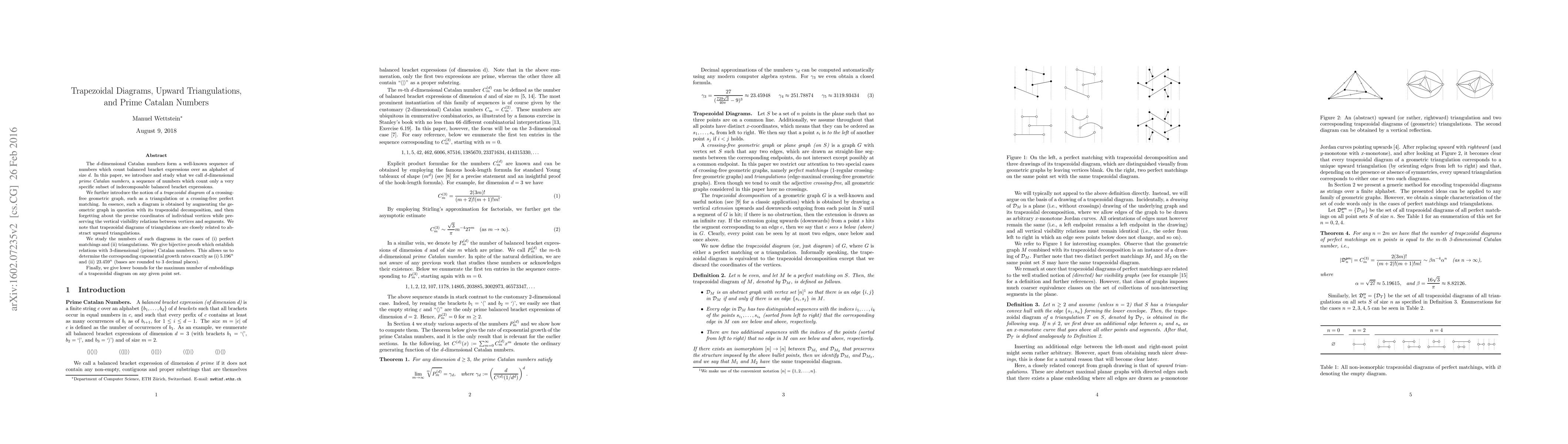 The d-dimensional Catalan numbers form a well-known sequence of numbers which count balanced bracket expressions over an alphabet of size d. In this paper, we introduce and study what we call d-dimensional prime Catalan numbers, a sequence of numbers which count only a very specific subset of indecomposable balanced bracket expressions. We further introduce the notion of a trapezoidal diagram of a crossing-free geometric graph, such as a triangulation or a crossing-free perfect matching. In essence, such a diagram is obtained by augmenting the geometric graph in question with its trapezoidal decomposition, and then forgetting about the precise coordinates of individual vertices while preserving the vertical visibility relations between vertices and segments. We note that trapezoidal diagrams of triangulations are closely related to abstract upward triangulations. We study the numbers of such diagrams in the cases of (i) perfect matchings and (ii) triangulations. We give bijective proofs which establish relations with 3-dimensional (prime) Catalan numbers. This allows us to determine the corresponding exponential growth rates exactly as (i) 5.196^n and (ii) 23.459^n (bases are rounded to 3 decimal places). Finally, we give lower bounds for the maximum number of embeddings of a trapezoidal diagram on any given point set.