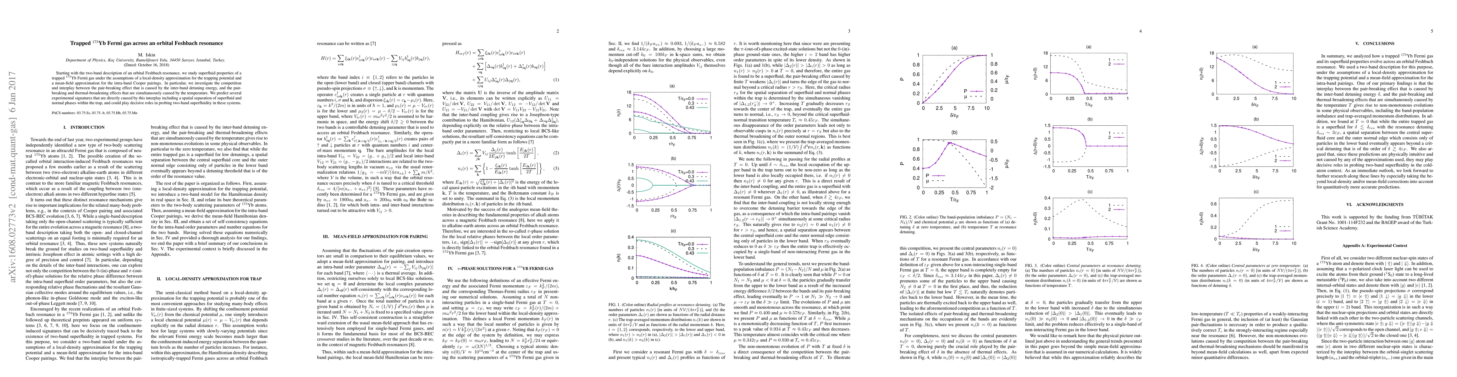 Starting with the two-band description of an orbital Feshbach resonance, we study superfluid properties of a trapped $^{173}$Yb Fermi gas under the assumptions of a local-density approximation for the trapping potential and a mean-field approximation for the intra-band Cooper pairings. In particular, we investigate the competition and interplay between the pair-breaking effect that is caused by the inter-band detuning energy, and the pair-breaking and thermal-broadening effects that are simultaneously caused by the temperature. We predict several experimental signatures that are directly caused by this interplay including a spatial separation of superfluid and normal phases within the trap, and could play decisive roles in probing two-band superfluidity in these systems.