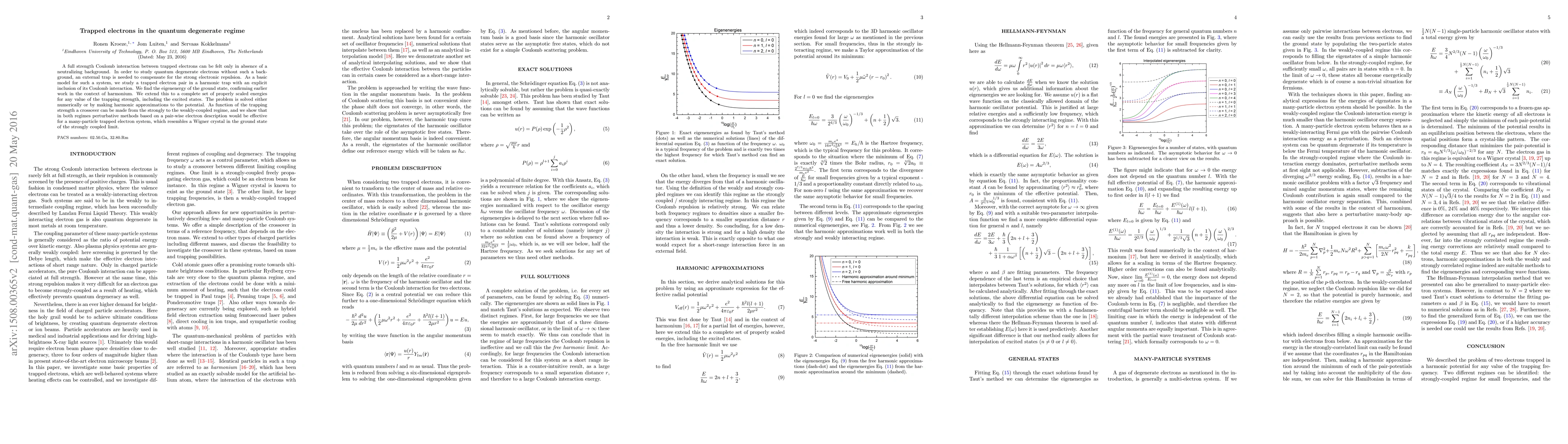 A full strength Coulomb interaction between trapped electrons can be felt only in absence of a neutralizing background. In order to study quantum degenerate electrons without such a background, an external trap is needed to compensate for the strong electronic repulsion. As a basic model for such a system, we study a trapped electron pair in a harmonic trap with an explicit inclusion of its Coulomb interaction. We find the eigenenergy of the ground state, confirming earlier work in the context of harmonium. We extend this to a complete set of properly scaled energies for any value of the trapping strength, including the excited states. The problem is solved either numerically or by making harmonic approximations to the potential. As function of the trapping strength a crossover can be made from the strongly to the weakly-coupled regime, and we show that in both regimes perturbative methods based on a pair-wise electron description would be effective for a many-particle trapped electron system, which resembles a Wigner crystal in the ground state of the strongly coupled limit.