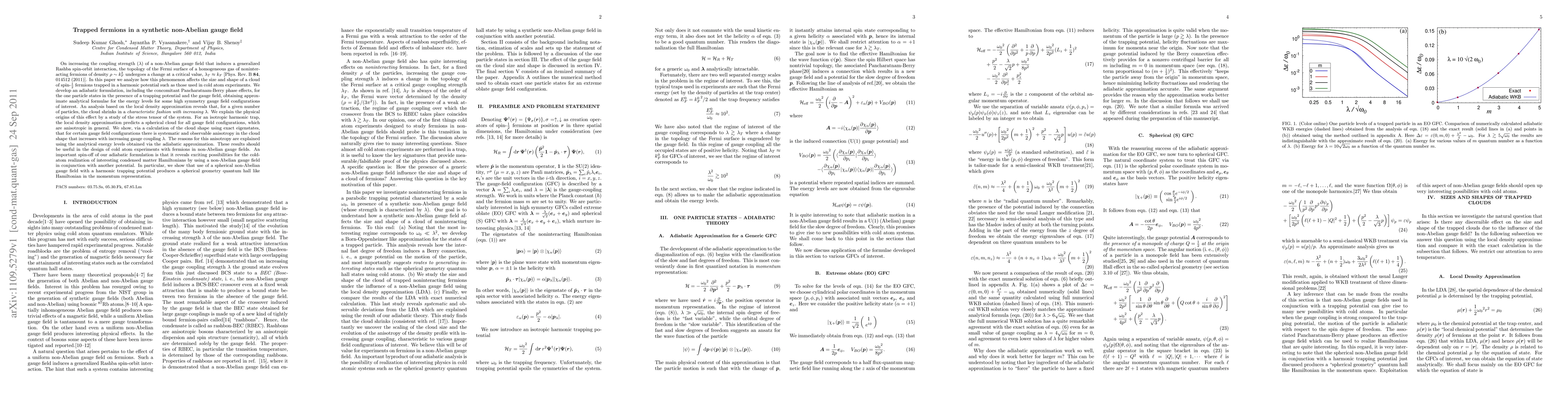 On increasing the coupling strength ($\lambda$) of a non-Abelian gauge field that induces a generalized Rashba spin-orbit interaction, the topology of the Fermi surface of a homogeneous gas of noninteracting fermions of density $\rho \sim \kf^3$ undergoes a change at a critical value, $\lambda_T \approx \kf$ [Phys. Rev. B {\bf 84}, 014512 (2011)]. In this paper we analyze how this phenomenon affects the size and shape of a cloud of spin-$\half$ fermions trapped in a harmonic potential such as those used in cold atom experiments. We develop an adiabatic formulation, including the concomitant Pancharatnam-Berry phase effects, for the one particle states in the presence of a trapping potential and the gauge field, obtaining approximate analytical formulae for the energy levels for some high symmetry gauge field configurations of interest. An analysis based on the local density approximation reveals that, for a given number of particles, the cloud shrinks in a {\em characteristic fashion with increasing $\lambda$}. For an isotropic harmonic trap, the local density approximation predicts a spherical cloud for all gauge field configurations, which are anisotropic in general. We show, via a calculation of the cloud shape using exact eigenstates, that for certain gauge field configurations there is systematic and observable anisotropy in the cloud shape that increases with increasing gauge coupling $\lambda$. These results should be useful in the design of cold atom experiments with fermions in non-Abelian gauge fields. An important spin-off of our adiabatic formulation is that it reveals exciting possibilities for the cold-atom realization of interesting condensed matter Hamiltonians (eg. quantum hall spherical geometry) by using a non-Abelian gauge field in conjunction with another potential.