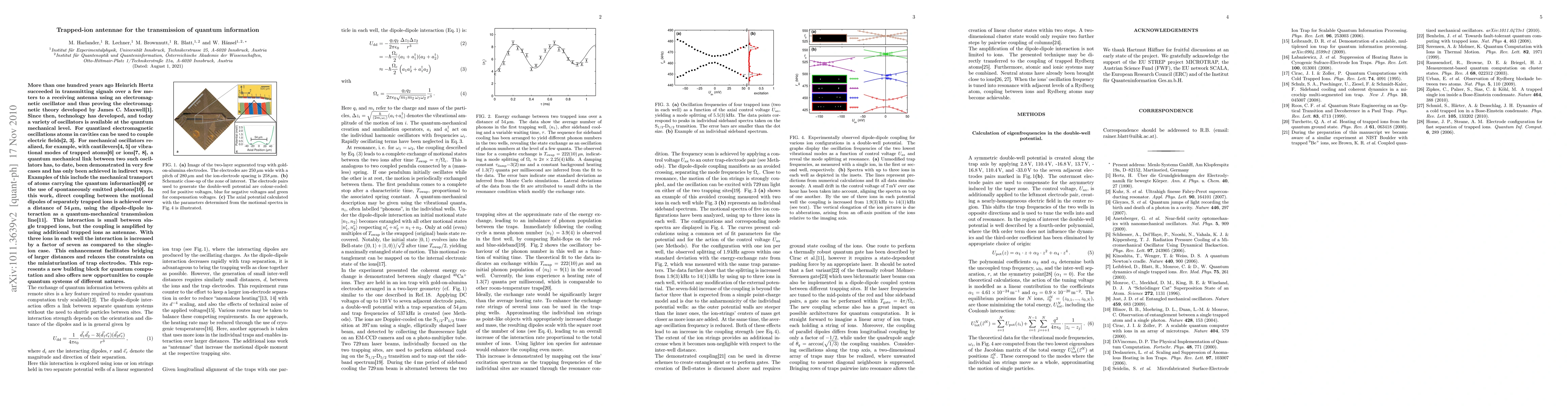 More than one hundred years ago Heinrich Hertz succeeded in transmitting signals over a few meters to a receiving antenna using an electromagnetic oscillator and thus proving the electromagnetic theory developed by James C. Maxwell[1]. Since then, technology has developed, and today a variety of oscillators is available at the quantum mechanical level. For quantized electromagnetic oscillations atoms in cavities can be used to couple electric fields[2, 3]. For mechanical oscillators realized, for example, with cantilevers[4, 5] or vibrational modes of trapped atoms[6] or ions[7, 8], a quantum mechanical link between two such oscillators has, to date, been demonstrated in very few cases and has only been achieved in indirect ways. Examples of this include the mechanical transport of atoms carrying the quantum information[9] or the use of spontaneously emitted photons[10]. In this work, direct coupling between the motional dipoles of separately trapped ions is achieved over a distance of 54 {\mu}m, using the dipole-dipole interaction as a quantum-mechanical transmission line[11]. This interaction is small between single trapped ions, but the coupling is amplified by using additional trapped ions as antennae. With three ions in each well the interaction is increased by a factor of seven as compared to the singleion case. This enhancement facilitates bridging of larger distances and relaxes the constraints on the miniaturization of trap electrodes. This represents a new building block for quantum computation and also offers new opportunities to couple quantum systems of different natures.