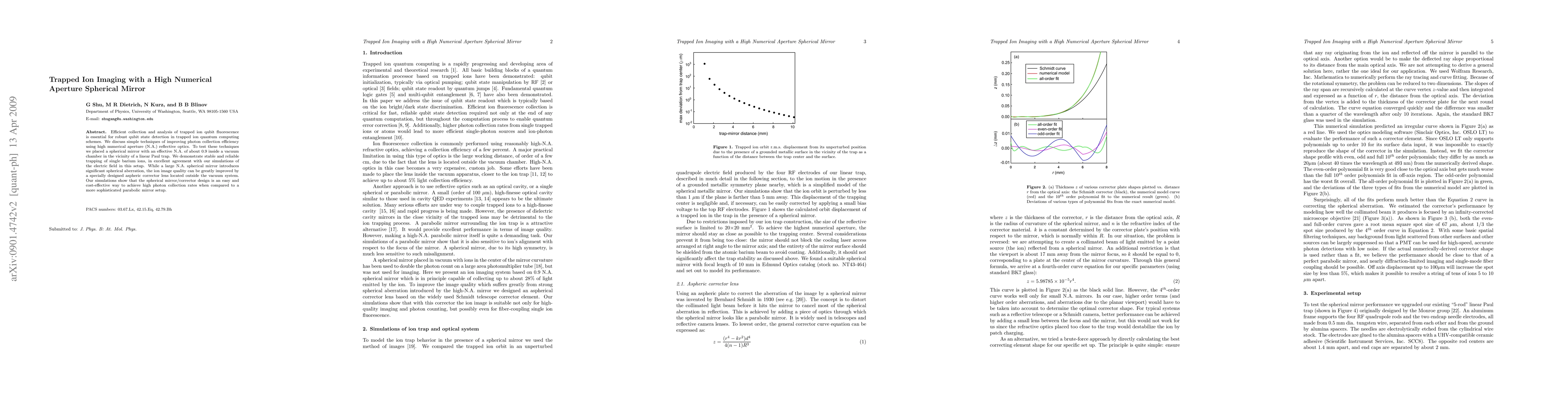 The research demonstrates the use of a high numerical aperture spherical mirror with an aspheric corrector lens to improve photon collection efficiency for trapped ion qubit fluorescence in quantum computing. This method shows stable ion trapping and high photon collection rates, offering a cost-effective alternative to parabolic mirror setups.