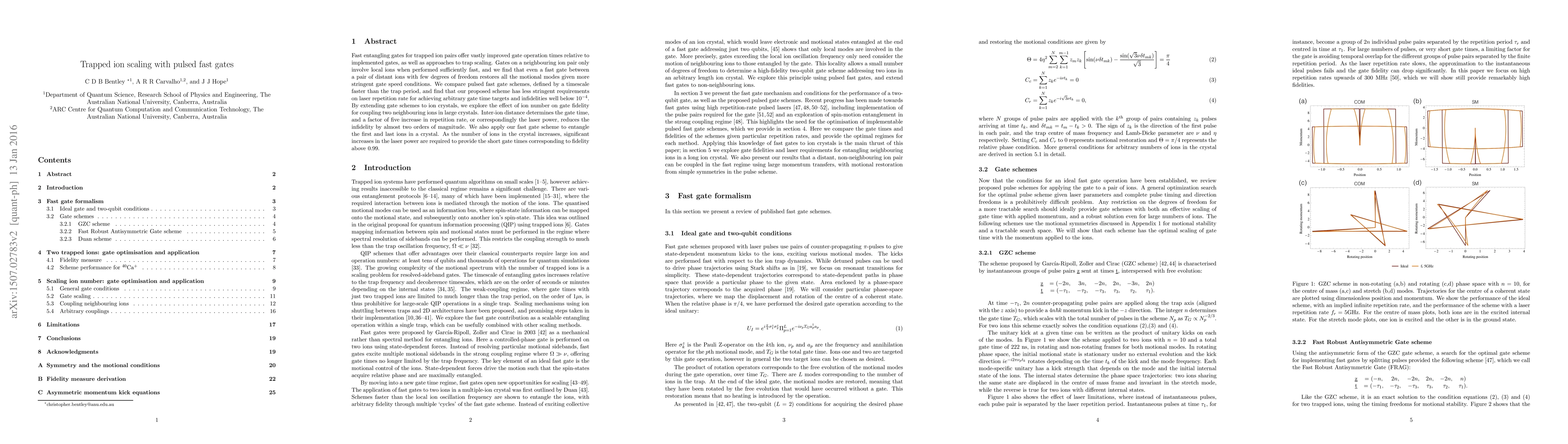 This paper proposes a pulsed fast gate scheme for trapped ions that significantly improves gate operation times and scalability, achieving gate fidelities below $10^{-4}$ with less stringent laser requirements. The study shows that while gate times increase with inter-ion distance, the infidelity can be reduced by increasing laser repetition rate or power, highlighting the challenges of scaling to large ion crystals.