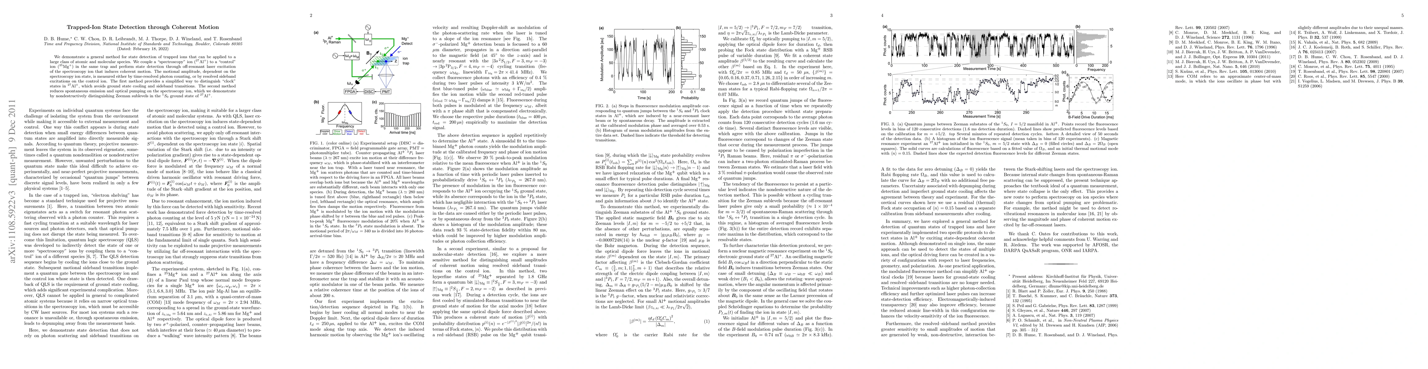 This paper presents a method for detecting trapped ion states using coherent motion induced by off-resonant laser excitation, coupling an Al+ "spectroscopy" ion to a Mg+ "control" ion. The technique allows for nondestructive state detection, distinguishing clock states in Al+ and Zeeman sublevels in its ground state.