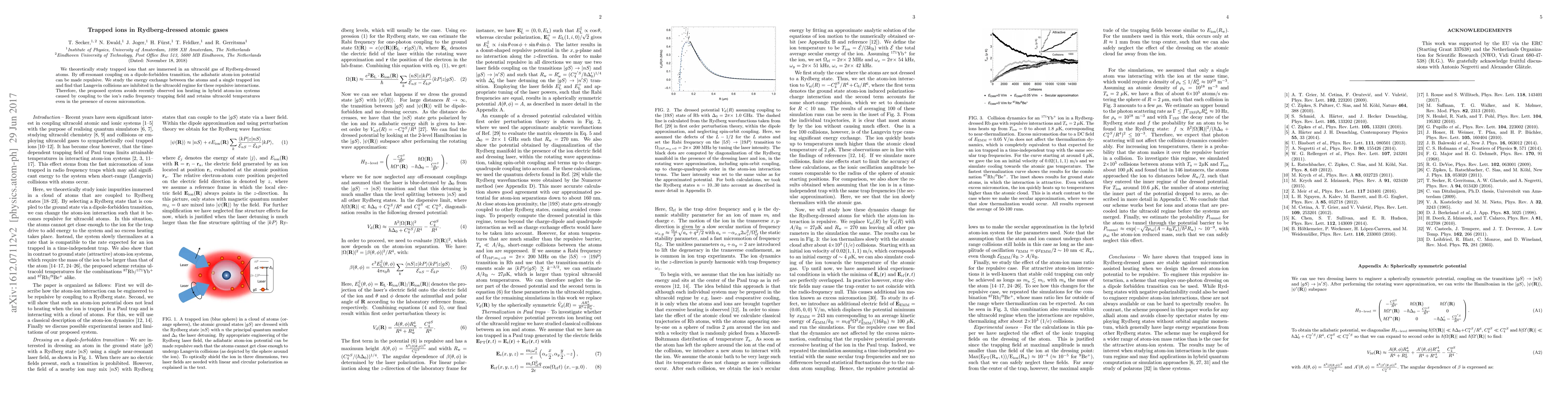 This paper theoretically investigates trapped ions in a gas of Rydberg-dressed atoms, showing that repulsive adiabatic atom-ion potentials inhibit Langevin collisions and prevent ion heating, thus maintaining ultracold temperatures despite excess micromotion.