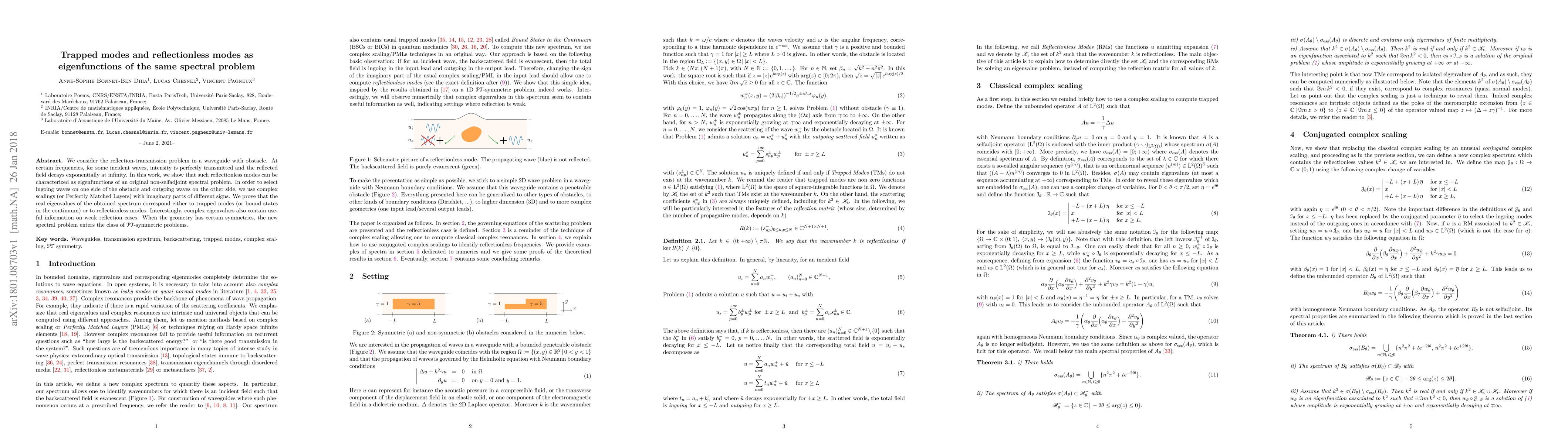 Researchers show that reflectionless modes in a waveguide with an obstacle can be characterized as eigenfunctions of an original non-selfadjoint spectral problem, providing insight into trapped modes and useful information on weak reflection cases.