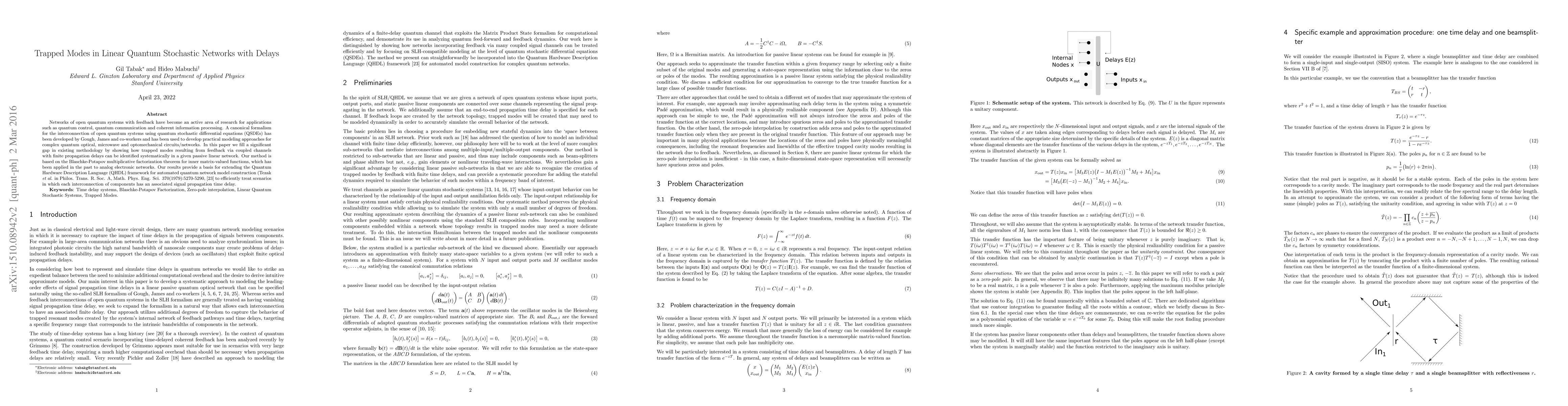 Networks of open quantum systems with feedback have become an active area of research for applications such as quantum control, quantum communication and coherent information processing. A canonical formalism for the interconnection of open quantum systems using quantum stochastic differential equations (QSDEs) has been developed by Gough, James and co-workers and has been used to develop practical modeling approaches for complex quantum optical, microwave and optomechanical circuits/networks. In this paper we fill a significant gap in existing methodology by showing how trapped modes resulting from feedback via coupled channels with finite propagation delays can be identified systematically in a given passive linear network. Our method is based on the Blaschke-Potapov multiplicative factorization theorem for inner matrix-valued functions, which has been applied in the past to analog electronic networks. Our results provide a basis for extending the Quantum Hardware Description Language (QHDL) framework for automated quantum network model construction (Tezak \textit{et al.} in Philos. Trans. R. Soc. A, Math. Phys. Eng. Sci. 370(1979):5270-5290, to efficiently treat scenarios in which each interconnection of components has an associated signal propagation time delay.