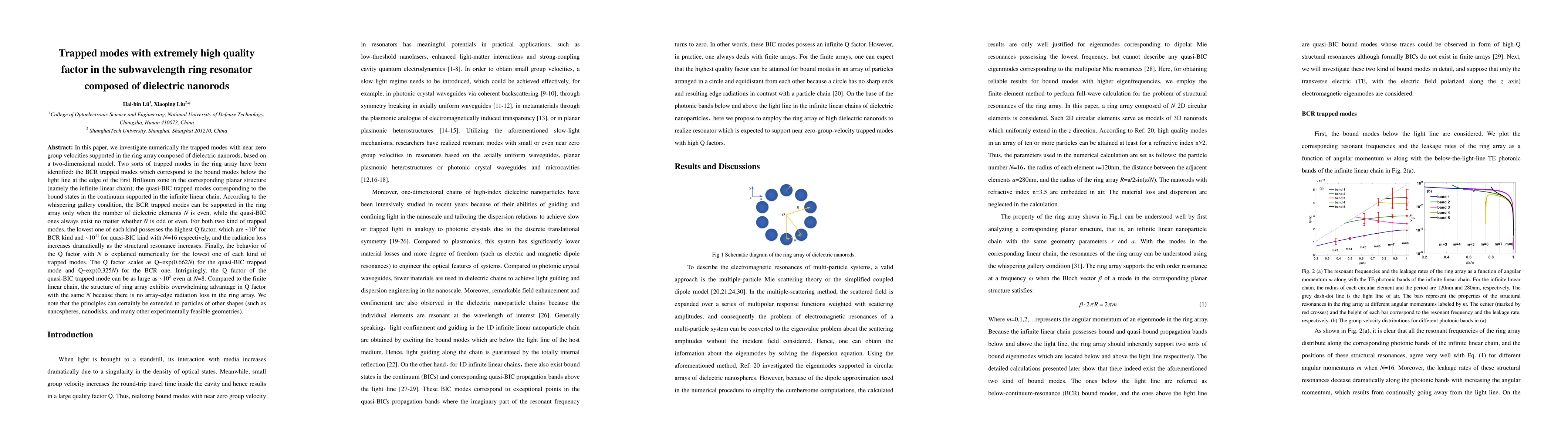 In this paper, we investigate numerically the trapped modes with near zero group velocities supported in the ring array composed of dielectric nanorods, based on a two-dimensional model. Two sorts of trapped modes in the ring array have been identified: the BCR trapped modes which correspond to the bound modes below the light line at the edge of the first Brillouin zone in the corresponding planar structure (namely the infinite linear chain); the quasi-BIC trapped modes corresponding to the bound states in the continuum supported in the infinite linear chain. According to the whispering gallery condition, the BCR trapped modes can be supported in the ring array only when the number of dielectric elements N is even, while the quasi-BIC ones always exist no matter whether N is odd or even. For both two kind of trapped modes, the lowest one of each kind possesses the highest Q factor, which are ~105 for BCR kind and ~1011 for quasi-BIC kind with N=16 respectively, and the radiation loss increases dramatically as the structural resonance increases. Finally, the behavior of the Q factor with N is explained numerically for the lowest one of each kind of trapped modes. The Q factor scales as Q~exp(0.662N) for the quasi-BIC trapped mode and Q~exp(0.325N) for the BCR one. Intriguingly, the Q factor of the quasi-BIC trapped mode can be as large as ~105 even at N=8. Compared to the finite linear chain, the structure of ring array exhibits overwhelming advantage in Q factor with the same N because there is no array-edge radiation loss in the ring array. We note that the principles can certainly be extended to particles of other shapes (such as nanospheres, nanodisks, and many other experimentally feasible geometries).