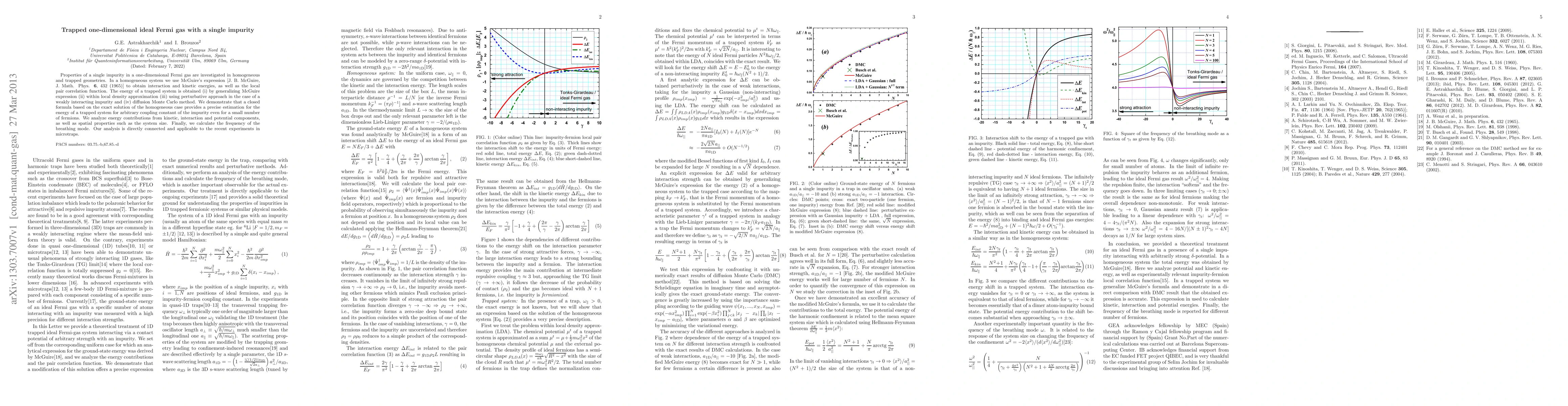 Properties of a single impurity in a one-dimensional Fermi gas are investigated in homogeneous and trapped geometries. In a homogeneous system we use McGuire's expression [J. B. McGuire, J. Math. Phys. 6, 432 (1965)] to obtain interaction and kinetic energies, as well as the local pair correlation function. The energy of a trapped system is obtained (i) by generalizing McGuire expression (ii) within local density approximation (iii) using perturbative approach in the case of a weakly interacting impurity and (iv) diffusion Monte Carlo method. We demonstrate that a closed formula based on the exact solution of the homogeneous case provides a precise estimation for the energy of a trapped system for arbitrary coupling constant of the impurity even for a small number of fermions. We analyze energy contributions from kinetic, interaction and potential components, as well as spatial properties such as the system size. Finally, we calculate the frequency of the breathing mode. Our analysis is directly connected and applicable to the recent experiments in microtraps.