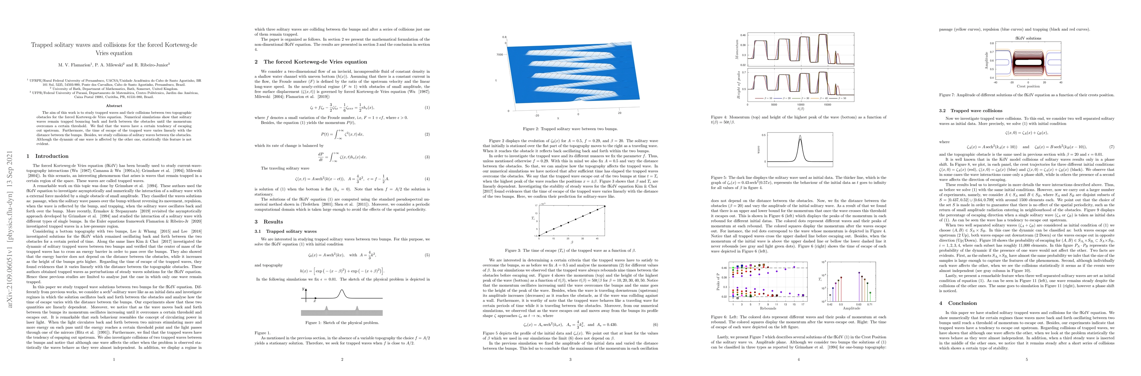 This paper investigates trapped solitary waves and their collisions between two topographic obstacles in the forced Korteweg-de Vries equation, revealing that waves can escape upstream once their momentum exceeds a threshold, with escape time linearly dependent on obstacle distance. Collisions between waves show dynamic interaction but lack statistical significance.
