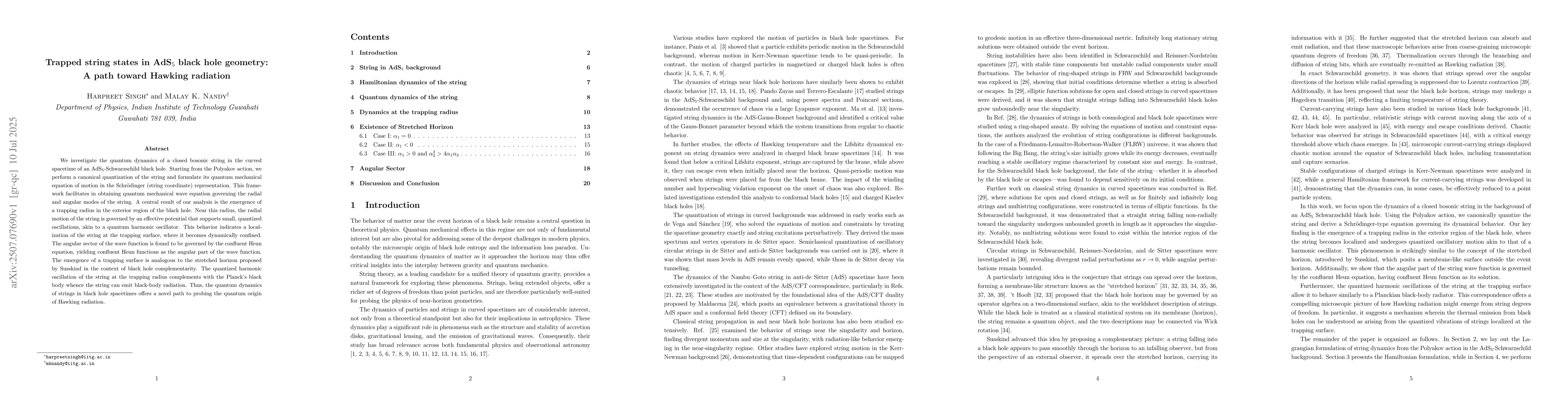 We investigate the quantum dynamics of a closed bosonic string in the curved spacetime of an AdS$_5$-Schwarzschild black hole. Starting from the Polyakov action, we perform a canonical quantization of the string and formulate its quantum mechanical equation of motion in the Schr\"odinger (string coordinate) representation. This framework facilitates in obtaining quantum mechanical wave equation governing the radial and angular modes of the string. A central result of our analysis is the emergence of a trapping radius in the exterior region of the black hole. Near this radius, the radial motion of the string is governed by an effective potential that supports small, quantized oscillations, akin to a quantum harmonic oscillator. This behavior indicates a localization of the string at the trapping surface, where it becomes dynamically confined. The angular sector of the wave function is found to be governed by the confluent Heun equation, yielding confluent Heun functions as the angular part of the wave function. The emergence of a trapping surface is analogous to the stretched horizon proposed by Susskind in the context of black hole complementarity. The quantized harmonic oscillation of the string at the trapping radius complements with the Planck's black body whence the string can emit black-body radiation. Thus, the quantum dynamics of strings in black hole spacetimes offers a novel path to probing the quantum origin of Hawking radiation.