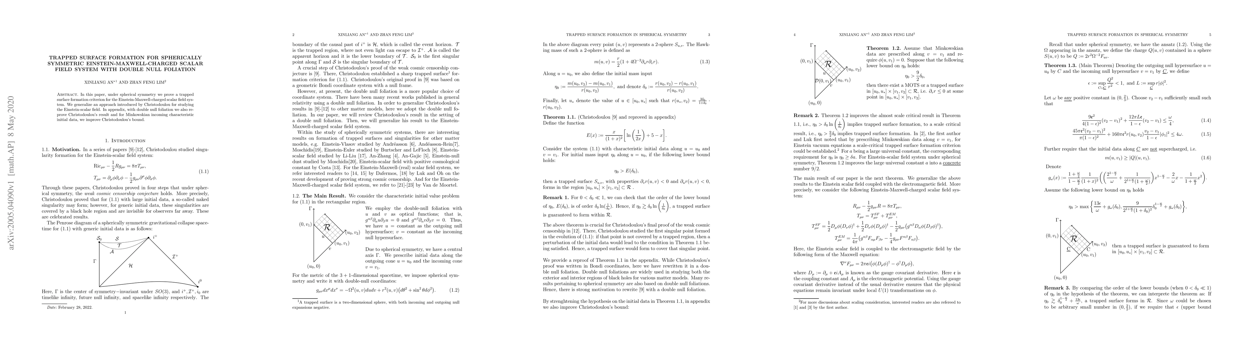 This paper establishes a trapped surface formation criterion for the Einstein-Maxwell-charged scalar field system under spherical symmetry, generalizing Christodoulou's method. Additionally, it improves Christodoulou's bound for Minkowskian incoming characteristic initial data using double null foliation.