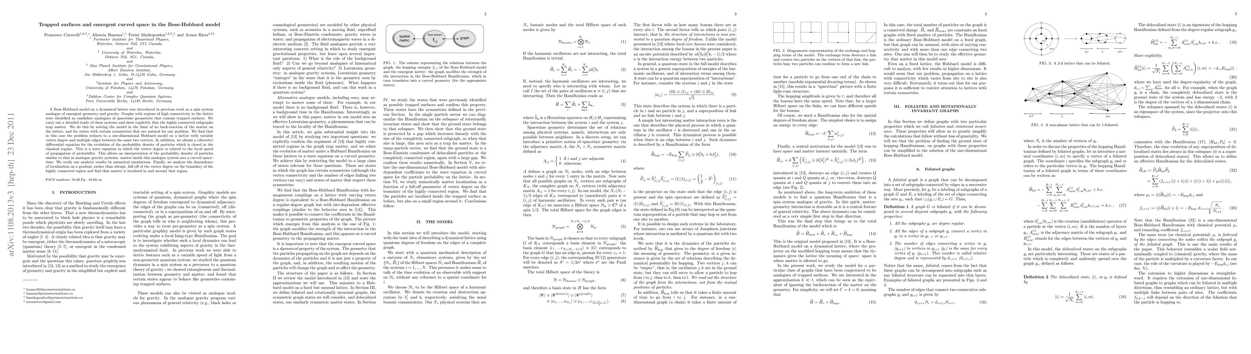 A Bose-Hubbard model on a dynamical lattice was introduced in previous work as a spin system analogue of emergent geometry and gravity. Graphs with regions of high connectivity in the lattice were identified as candidate analogues of spacetime geometries that contain trapped surfaces. We carry out a detailed study of these systems and show explicitly that the highly connected subgraphs trap matter. We do this by solving the model in the limit of no back-reaction of the matter on the lattice, and for states with certain symmetries that are natural for our problem. We find that in this case the problem reduces to a one-dimensional Hubbard model on a lattice with variable vertex degree and multiple edges between the same two vertices. In addition, we obtain a (discrete) differential equation for the evolution of the probability density of particles which is closed in the classical regime. This is a wave equation in which the vertex degree is related to the local speed of propagation of probability. This allows an interpretation of the probability density of particles similar to that in analogue gravity systems: matter inside this analogue system sees a curved spacetime. We verify our analytic results by numerical simulations. Finally, we analyze the dependence of localization on a gradual, rather than abrupt, fall-off of the vertex degree on the boundary of the highly connected region and find that matter is localized in and around that region.