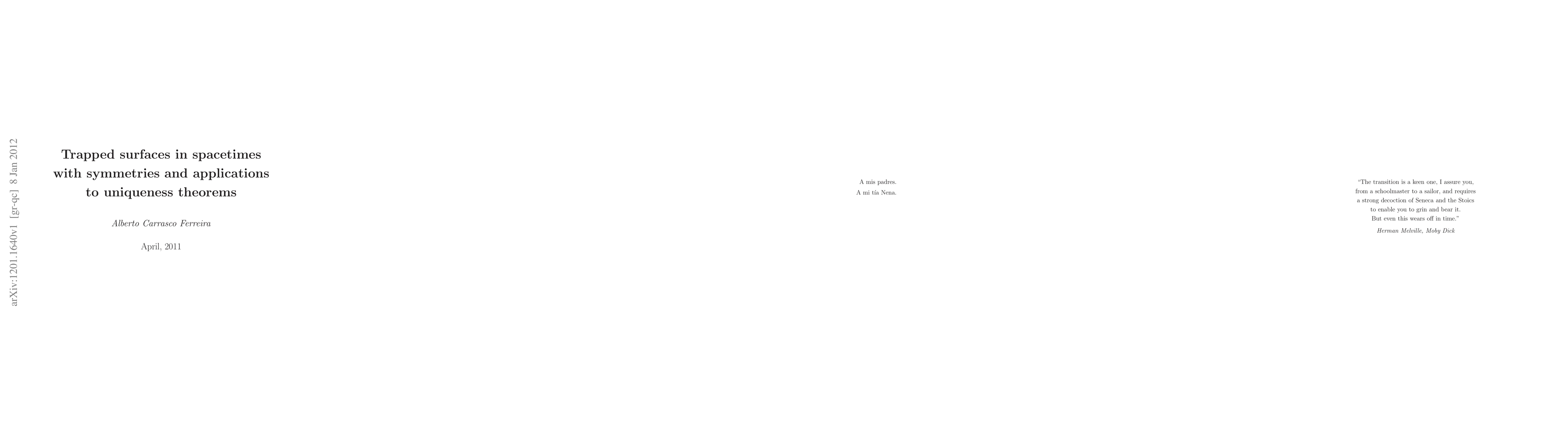 This thesis investigates trapped surfaces in symmetric spacetimes and their implications for black hole uniqueness theorems. It confirms that static black hole uniqueness theorems extend to static spacetimes with marginally outer trapped surfaces, under specific conditions. Additionally, it refutes a recent version of the Penrose inequality proposed by Bray and Khuri in 2009.