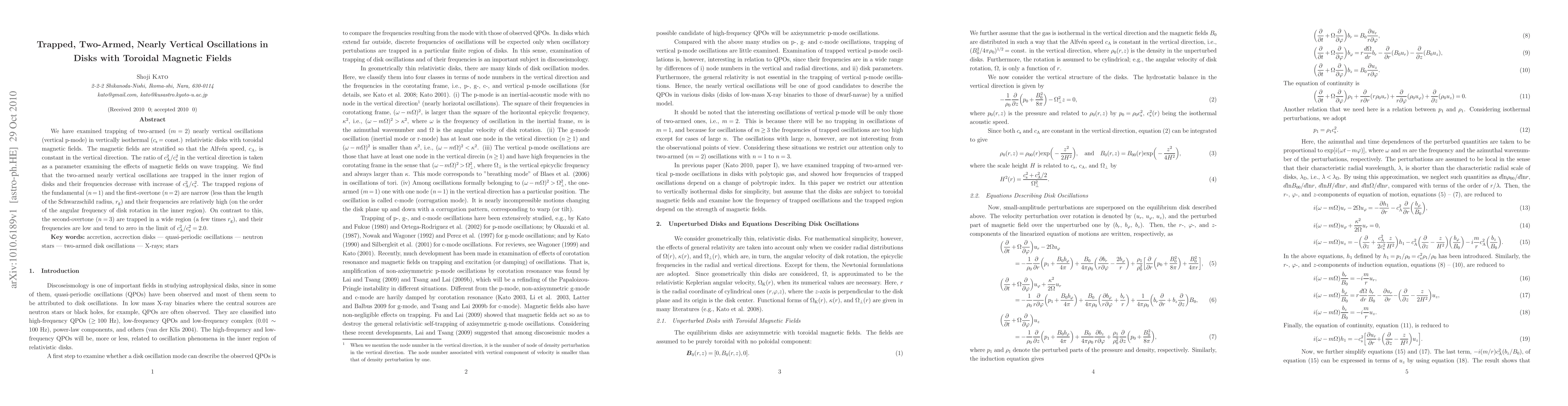 This paper investigates the trapping of two-armed vertical oscillations in relativistic disks with toroidal magnetic fields, finding that oscillations are confined in the inner regions with frequencies decreasing as the magnetic field strength increases. Higher overtones are trapped in wider regions with lower frequencies.