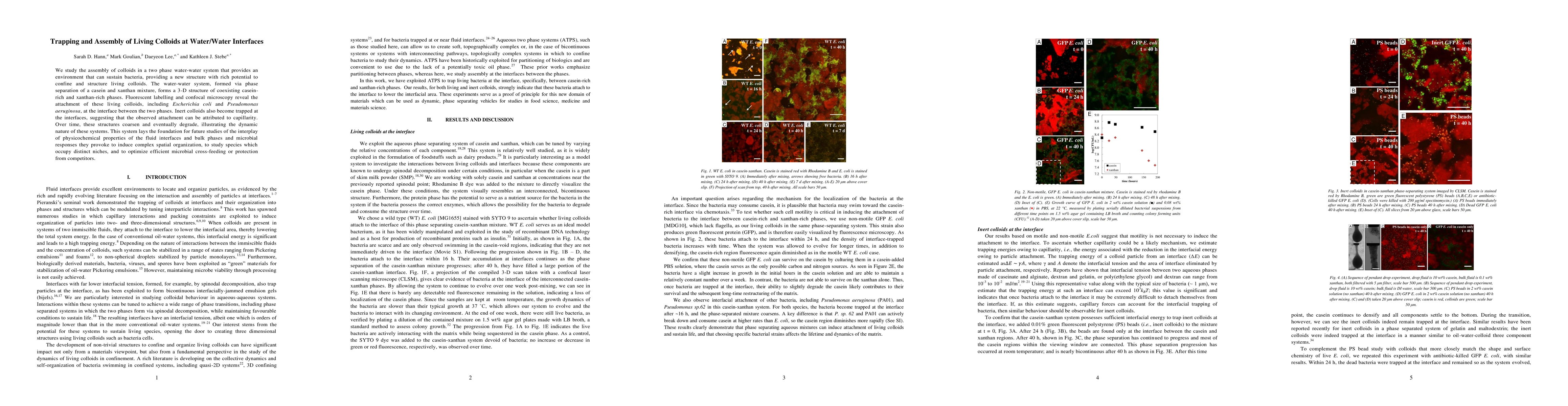 This study investigates the assembly of living and inert colloids at the interface of a two-phase water-water system formed by casein and xanthan, revealing the trapping of bacteria like Escherichia coli and Pseudomonas aeruginosa due to capillarity, with potential applications for microbial organization and interactions. The dynamic nature of these structures highlights the complex interplay between fluid interfaces and microbial responses.