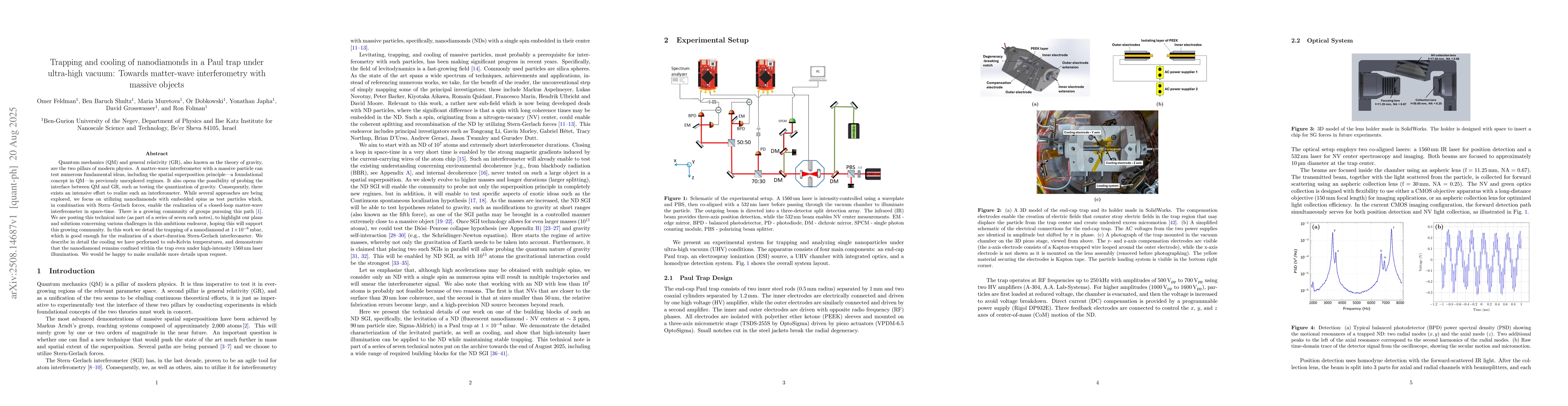 The research details trapping and cooling of nanodiamonds in a Paul trap under ultra-high vacuum (10^-8 mbar) for potential matter-wave interferometry with massive objects, utilizing Stern-Gerlach forces and active feedback cooling.
